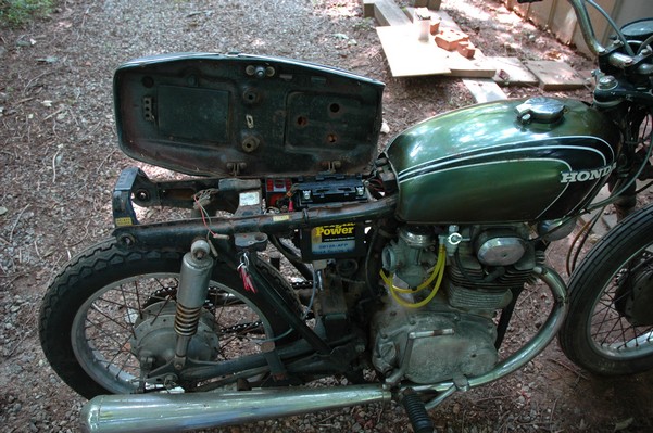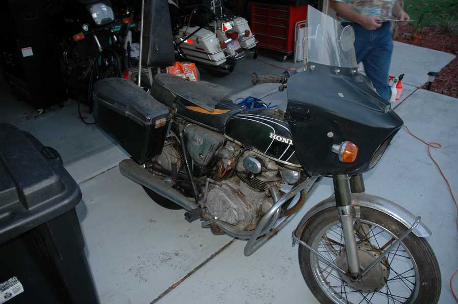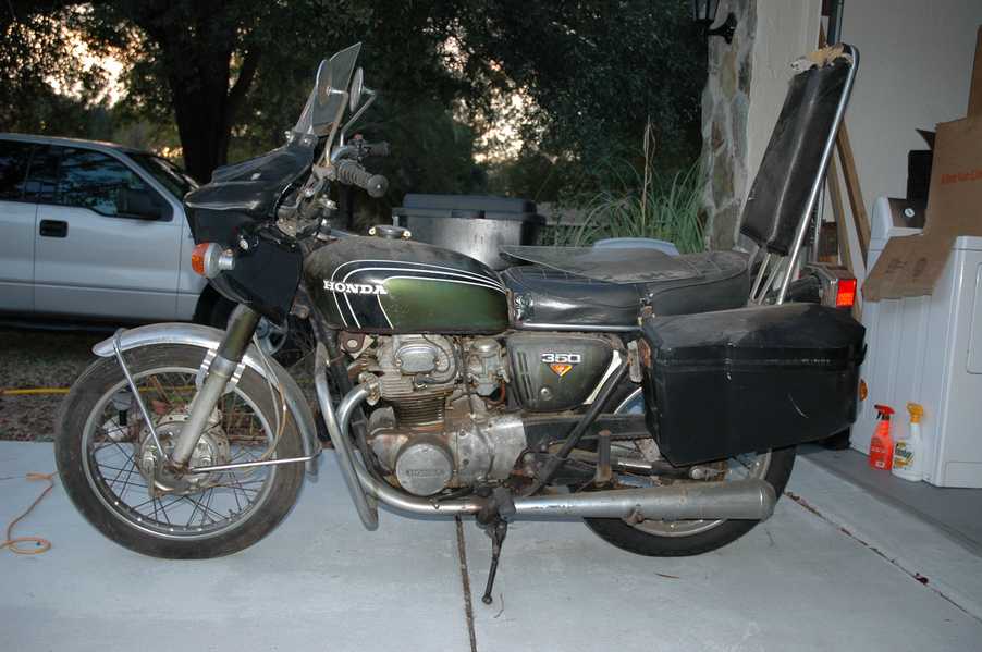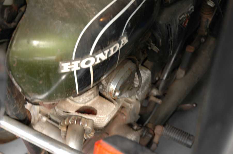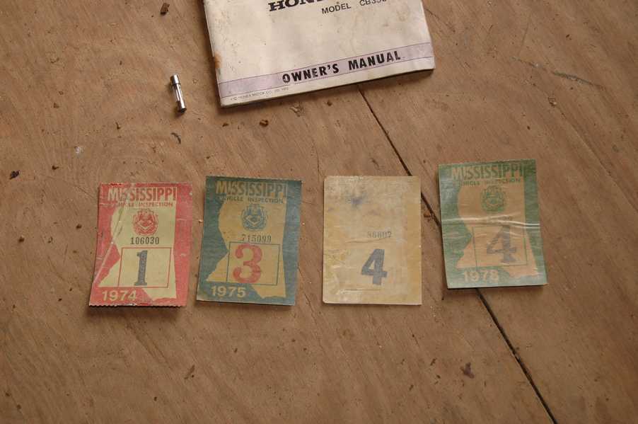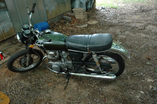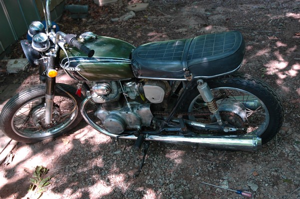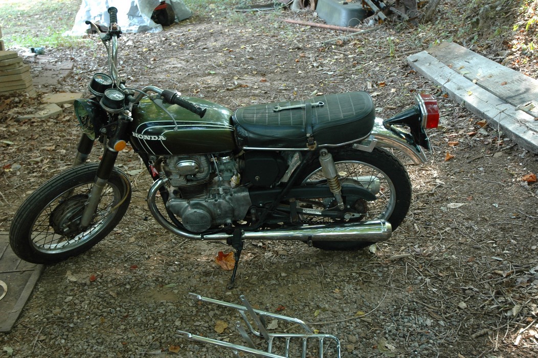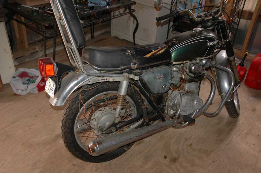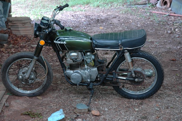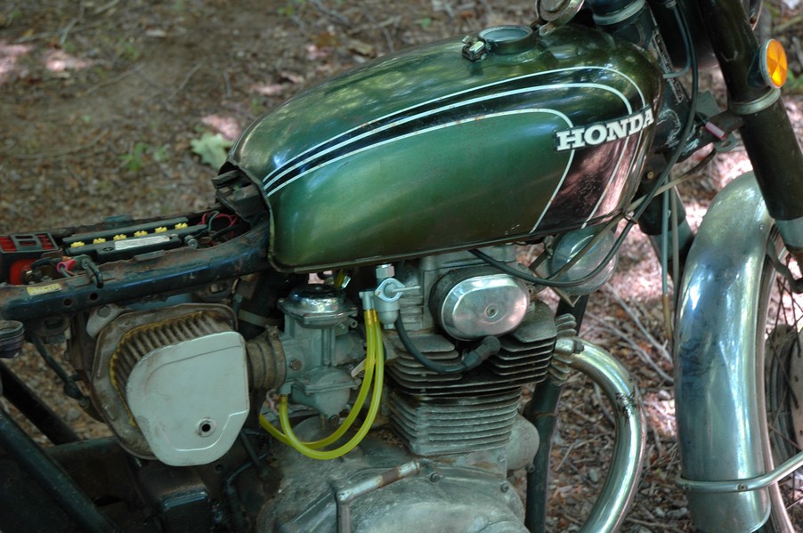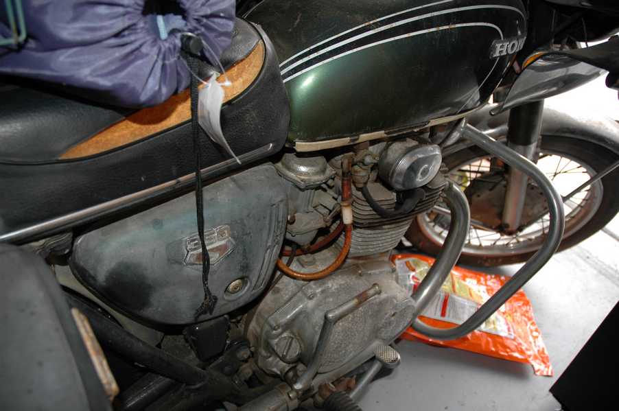 1972 Honda CB350According to honda.com, "Honda dealers sold more than a quarter-million CB350s over the model's five-year run - 67,180 of those in 1972 alone."So here is a 1972, one of the 67180. Thanks to Mark, it's my next project. These are pictures of it that I took when I picked it up. With 23390 miles, this one has seen more riding than the SL175. From what Mark says, I'll be the 3rd owner. This one is more complete than the 175 in some ways, since it does have its original owners manual and toolbox. Since my SL175 has been giving me some trouble, I decided to take a break and work on the CB for a little while. I started by taking off the accessories and giving it a bath. Wow, there was a motorcycle under that faring. In the pictures below you can see that the chrome front fender has some pitting, and of course I've included a picture of the ancient turn signal light bulb. The first owner had trouble with the rectifier, so he put on this aftermarket version. Unfortunately I sheared off the stud when I was taking off the acorn nut that holds on the sissy bar and suspension. I haven't taken it apart further yet to see how complicated the repair is going to be. The aftermarket rectfier looks a little bit recti-fried, so I'm going to try to find an OEM replacement on Ebay. Or is it the voltage regulator? Hmmm... me and lots of other people seem to get the two confused. With the saddle bags off, it is really starting to look like a CB. The sissy bar isn't going to be a part of the restoration, but I have found a luggage rack to put there instead. The seat cover is in rough shape, and so far all that I've found on ebay is a little bit expensive. I've decided to focus on getting it running first, then to worry about the seat cover in phase 2. I guess the battery was a little bit short, so someone put in this 1/4" piece of aluminum and 3/4" pieces of wood to stack it up a little bit higher. Under the owner's manual you can see four Mississippi inspection stickers, ranging from 1974 to 1978. The fuel line had reached it's service life limit some time ago, so it was actually the consistency of uncooked macaroni. If I tried to bend the line it would break off into crispy little pieces. The lever on the petcock is broken off too, which will be something good to fix in the long run. The especially astute reader might have noticed in an earlier picture the tell-tale pool of gasoline varnish on the top cooling fin of the left cylinder. This was actually coming from a leaking fuel tank. It had been repaired before, but the repair doesn't seem to be holding up too well. I'm hoping to use the Kreem products to seal the whole tank, especially since there was quite a bit of rust in the float bowls. Here you can see the original ignition key mounting location, and get a good idea of how dirty the whole frame is. Do you see the pool of varnish yet? Look in the pictures just above. There is a little cricket who is just itching to check it out. Below you can see the wax left on the front end parts, which will hopefully come off fairly easily. The rusted u-bolt is from the crash bar. I guess it wasn't chrome plated like the bar itself was. After all of that work, the bike was ready for a nap. You can see it snoozing and also see how dirty the bottom is. With everything off, you can really start to see some similarity between the CB and the SL175. The fenders are set up differently, and the SL has a double-downtube frame, and of course the exhaust is more like the CB175. The petcock has definitely seen better days. One of the many amenities that the CB has over the SL is the locking seat and helmet hooks. Since they are only accessible from under the locked seat, it gives an option for leaving a helmet in a semi-secure location. The air filters were dirty as I would have imagined, though I suspect they are servicable, which is more than I can say for the powder that I found on the 175. 6-2008 Update- It doesn't appear that it is possible to clean the filters. Replacements are expensive, and hard to find. The side covers have badly oxidized paint on the outside, and I'm hoping that they will look better after some cleaning. There is a rubber balancing tube that goes from one air cleaner to the other. In picture 3 you can see a screw head after removal by drill, and finally the crankcase vent tube (much like all to many other parts) has started reverting to its original ingredients. When I was coasting down the hill from the trailer to the work area, I noticed that the front brake was pretty weak. The back brake was also pretty weak, though mostly because one of the vent tubes was getting in the way of the pedal's travel. In the first picture you can see the squeeze. The last two show a few little wiring problems, though nothing major. Here is more creative wiring, along with a tank strap in pretty poor shape. The good news is that these are being reproduced and are available as new rubber. The rear fender will look a lot better after a rinse and polish, but that's for phase 2. Below in the first picture you can see the worst side of the engine, though I'm not sure where it got exposed to the elements. Maybe the motorcycle was parked under a lean-to, or something like that. The OEM toolkit is in good shape considering the circumstances, though it too could use a bath. The third picture is me trying to give the CB a little motivation by showing how pretty it can be. Hopefully the SL wasn't whispering sweet "engine not runnings" into it's ears. The last photo below is the "before bath" shot. These two are "after the bath" shots, and you can see a large difference. Photo 3 shows the degree of insect infestation in the cooling fins of the engine. The SL had the same problem. The last phot shows where the OEM turn signals will mount, along with the black headlight bucket. It will take some research to see if that is the stock color. The SL uses blue to match the tank and side covers. The last two pictures are espe