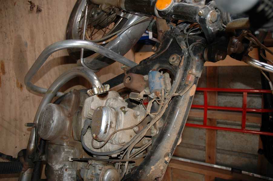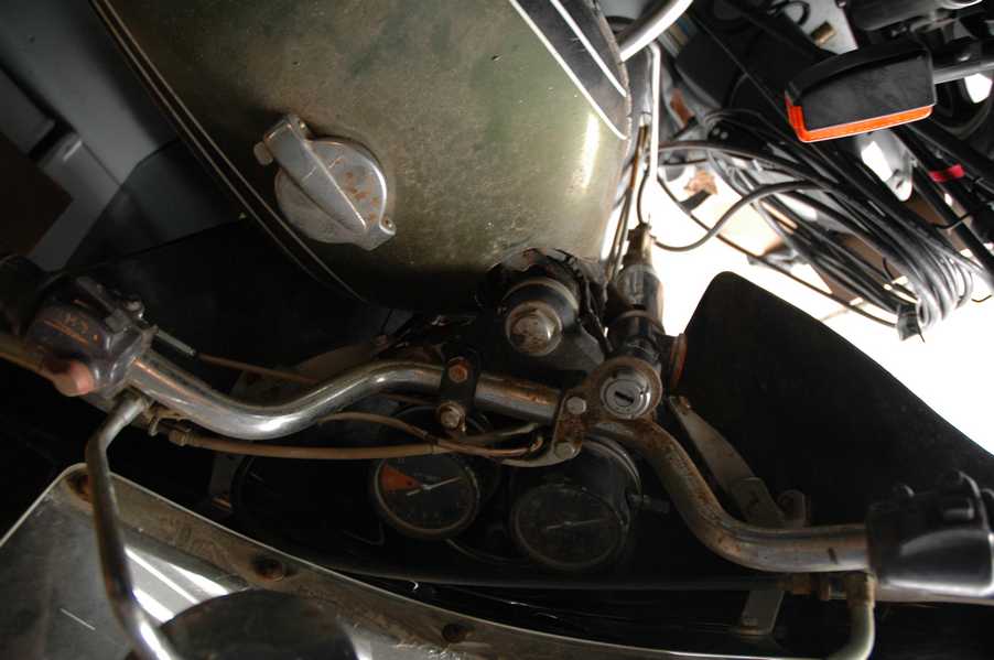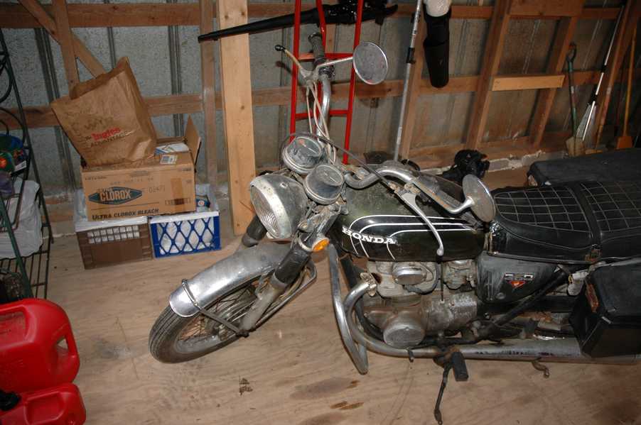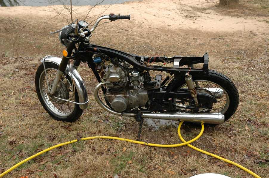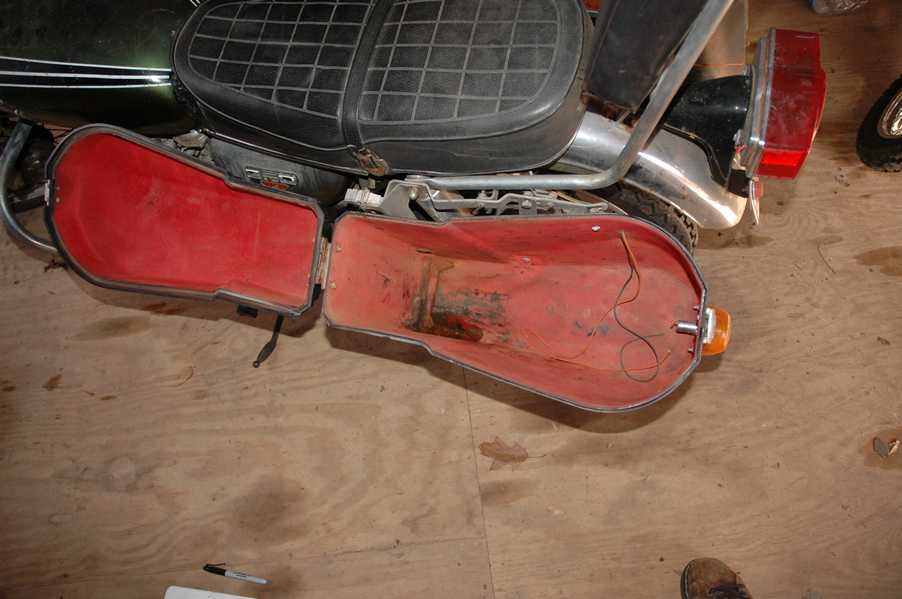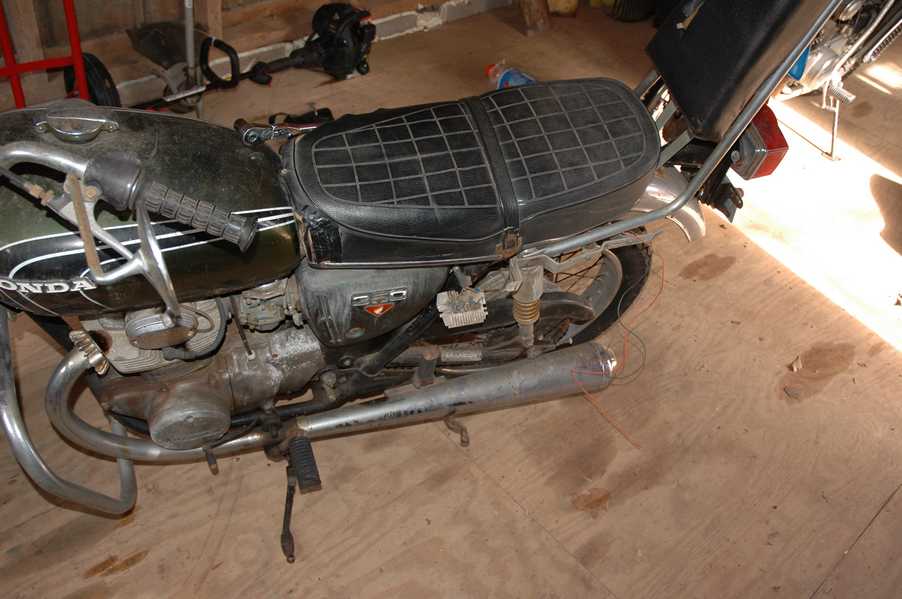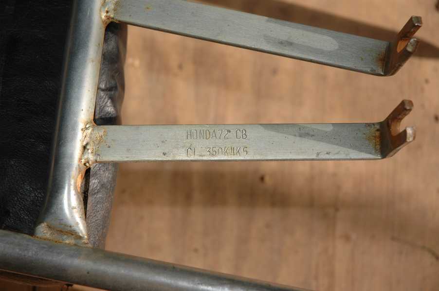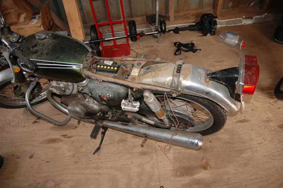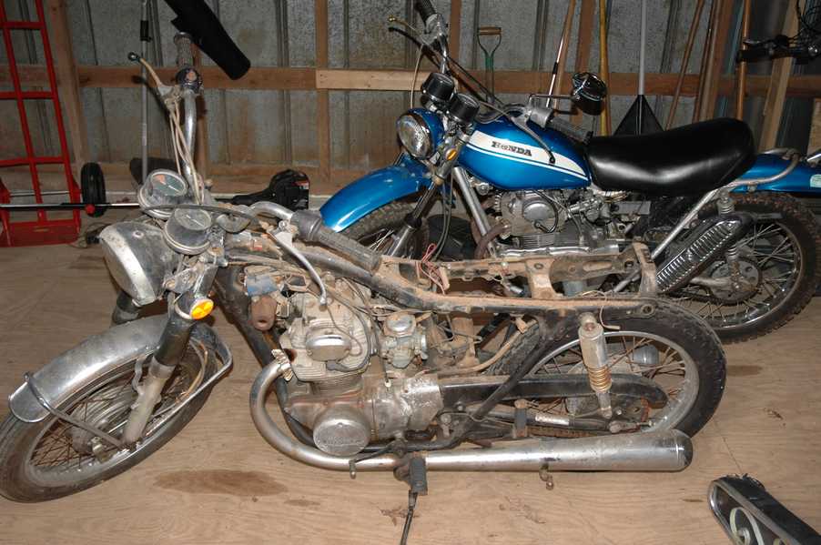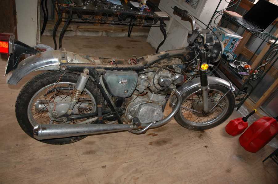 1972 Honda CB350According to honda.com, "Honda dealers sold more than a quarter-million CB350s over the model's five-year run - 67,180 of those in 1972 alone."So here is a 1972, one of the 67180. Thanks to Mark, it's my next project. These are pictures of it that I took when I picked it up. With 23390 miles, this one has seen more riding than the SL175. From what Mark says, I'll be the 3rd owner. This one is more complete than the 175 in some ways, since it does have its original owners manual and toolbox. Since my SL175 has been giving me some trouble, I decided to take a break and work on the CB for a little while. I started by taking off the accessories and giving it a bath. Wow, there was a motorcycle under that faring. In the pictures below you can see that the chrome front fender has some pitting, and of course I've included a picture of the ancient turn signal light bulb. The first owner had trouble with the rectifier, so he put on this aftermarket version. Unfortunately I sheared off the stud when I was taking off the acorn nut that holds on the sissy bar and suspension. I haven't taken it apart further yet to see how complicated the repair is going to be. The aftermarket rectfier looks a little bit recti-fried, so I'm going to try to find an OEM replacement on Ebay. Or is it the voltage regulator? Hmmm... me and lots of other people seem to get the two confused. With the saddle bags off, it is really starting to look like a CB. The sissy bar isn't going to be a part of the restoration, but I have found a luggage rack to put there instead. The seat cover is in rough shape, and so far all that I've found on ebay is a little bit expensive. I've decided to focus on getting it running first, then to worry about the seat cover in phase 2. I guess the battery was a little bit short, so someone put in this 1/4" piece of aluminum and 3/4" pieces of wood to stack it up a little bit higher. Under the owner's manual you can see four Mississippi inspection stickers, ranging from 1974 to 1978. The fuel line had reached it's service life limit some time ago, so it was actually the consistency of uncooked macaroni. If I tried to bend the line it would break off into crispy little pieces. The lever on the petcock is broken off too, which will be something good to fix in the long run. The especially astute reader might have noticed in an earlier picture the tell-tale pool of gasoline varnish on the top cooling fin of the left cylinder. This was actually coming from a leaking fuel tank. It had been repaired before, but the repair doesn't seem to be holding up too well. I'm hoping to use the Kreem products to seal the whole tank, especially since there was quite a bit of rust in the float bowls. Here you can see the original ignition key mounting location, and get a good idea of how dirty the whole frame is. Do you see the pool of varnish yet? Look in the pictures just above. There is a little cricket who is just itching to check it out. Below you can see the wax left on the front end parts, which will hopefully come off fairly easily. The rusted u-bolt is from the crash bar. I guess it wasn't chrome plated like the bar itself was. After all of that work, the bike was ready for a nap. You can see it snoozing and also see how dirty the bottom is. With everything off, you can really start to see some similarity between the CB and the SL175. The fenders are set up differently, and the SL has a double-downtube frame, and of course the exhaust is more like the CB175. The petcock has definitely seen better days. One of the many amenities that the CB has over the SL is the locking seat and helmet hooks. Since they are only accessible from under the locked seat, it gives an option for leaving a helmet in a semi-secure location. The air filters were dirty as I would have imagined, though I suspect they are servicable, which is more than I can say for the powder that I found on the 175. 6-2008 Update- It doesn't appear that it is possible to clean the filters. Replacements are expensive, and hard to find. The side covers have badly oxidized paint on the outside, and I'm hoping that they will look better after some cleaning. There is a rubber balancing tube that goes from one air cleaner to the other. In picture 3 you can see a screw head after removal by drill, and finally the crankcase vent tube (much like all to many other parts) has started reverting to its original ingredients. When I was coasting down the hill from the trailer to the work area, I noticed that the front brake was pretty weak. The back brake was also pretty weak, though mostly because one of the vent tubes was getting in the way of the pedal's travel. In the first picture you can see the squeeze. The last two show a few little wiring problems, though nothing major. Here is more creative wiring, along with a tank strap in pretty poor shape. The good news is that these are being reproduced and are available as new rubber. The rear fender will look a lot better after a rinse and polish, but that's for phase 2. Below in the first picture you can see the worst side of the engine, though I'm not sure where it got exposed to the elements. Maybe the motorcycle was parked under a lean-to, or something like that. The OEM toolkit is in good shape considering the circumstances, though it too could use a bath. The third picture is me trying to give the CB a little motivation by showing how pretty it can be. Hopefully the SL wasn't whispering sweet "engine not runnings" into it's ears. The last photo below is the "before bath" shot. These two are "after the bath" shots, and you can see a large difference. Photo 3 shows the degree of insect infestation in the cooling fins of the engine. The SL had the same problem. The last phot shows where the OEM turn signals will mount, along with the black headlight bucket. It will take some research to see if that is the stock color. The SL uses blue to match the tank and side covers. The last two pictures are espe