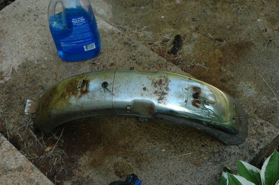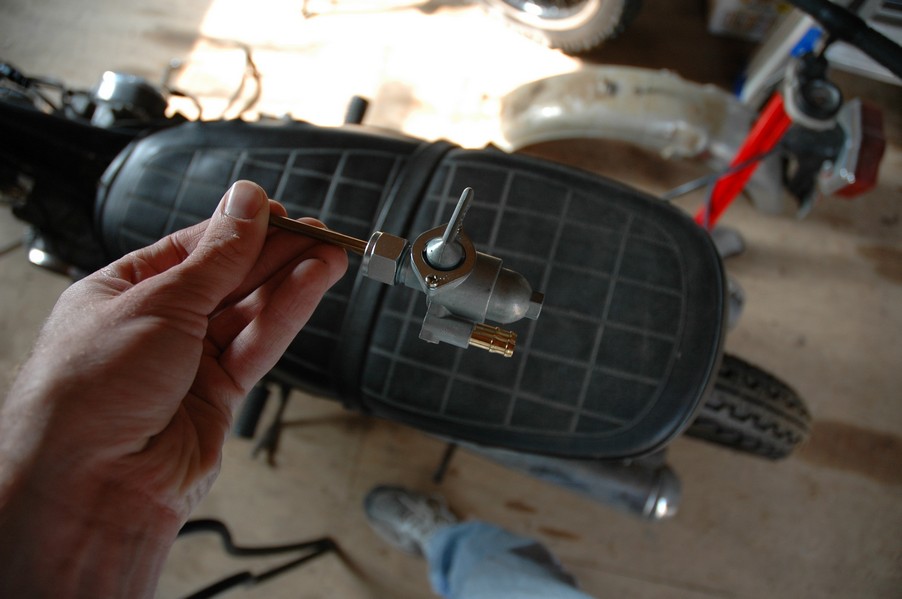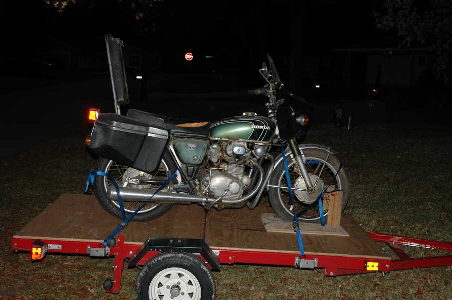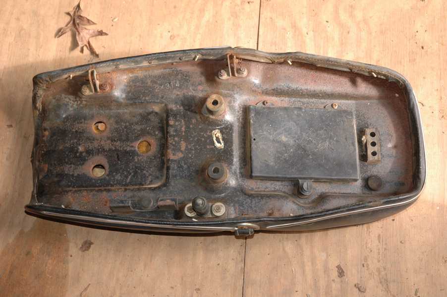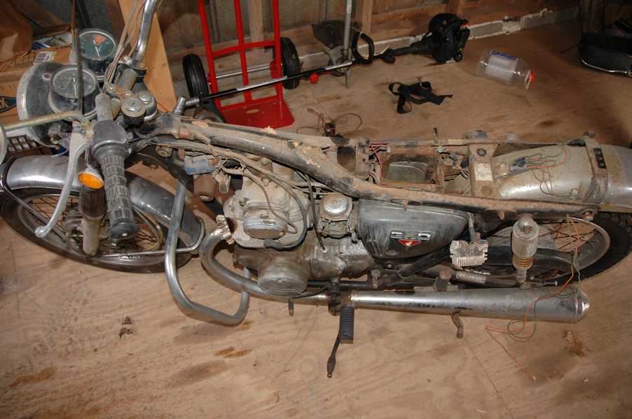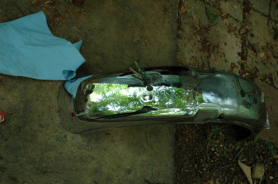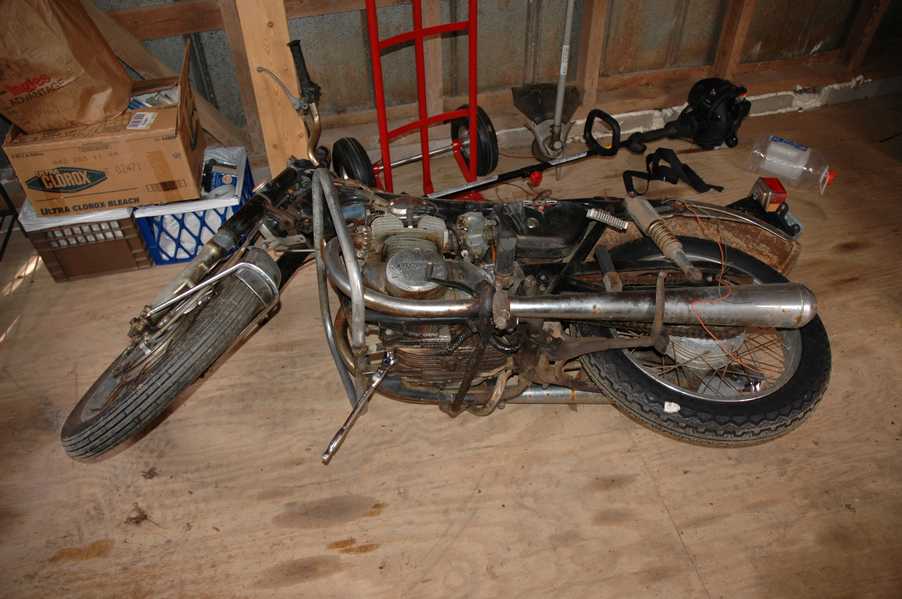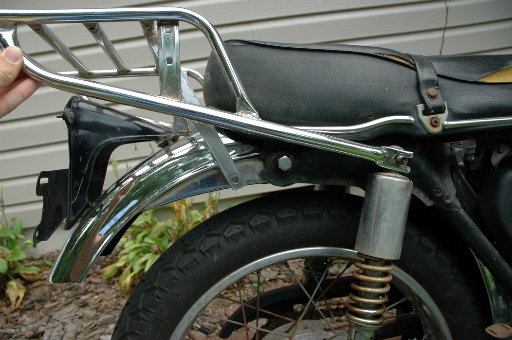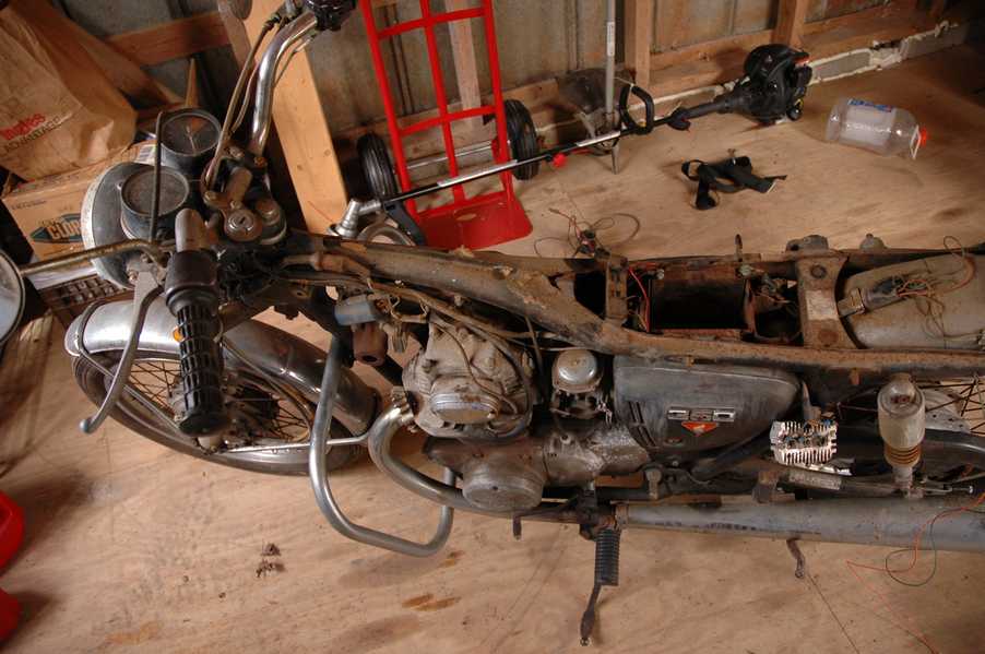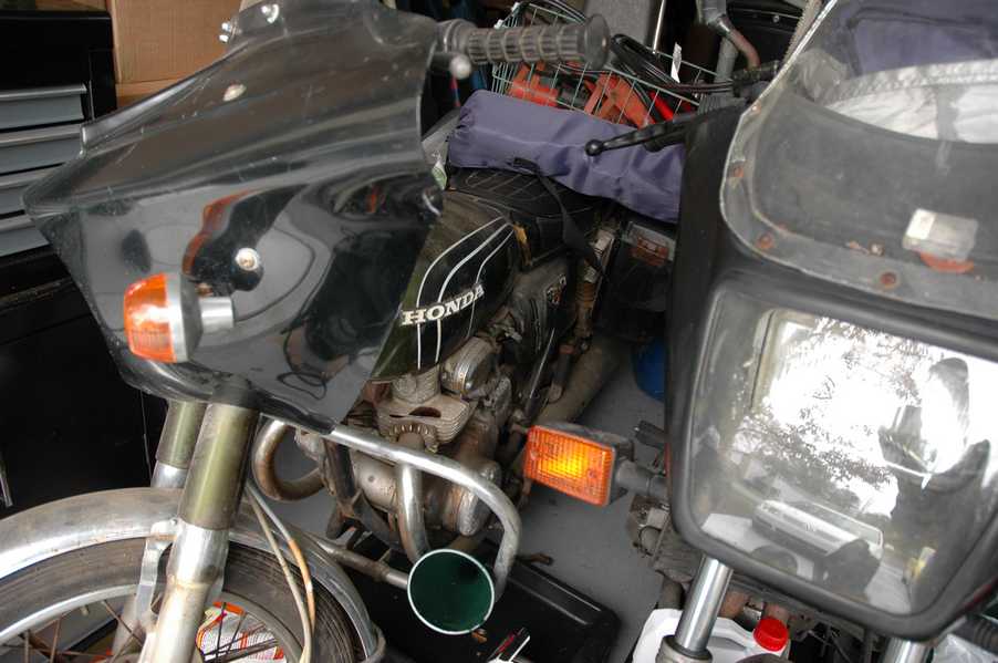 1972 Honda CB350According to honda.com, "Honda dealers sold more than a quarter-million CB350s over the model's five-year run - 67,180 of those in 1972 alone."So here is a 1972, one of the 67180. Thanks to Mark, it's my next project. These are pictures of it that I took when I picked it up. With 23390 miles, this one has seen more riding than the SL175. From what Mark says, I'll be the 3rd owner. This one is more complete than the 175 in some ways, since it does have its original owners manual and toolbox. Since my SL175 has been giving me some trouble, I decided to take a break and work on the CB for a little while. I started by taking off the accessories and giving it a bath. Wow, there was a motorcycle under that faring. In the pictures below you can see that the chrome front fender has some pitting, and of course I've included a picture of the ancient turn signal light bulb. The first owner had trouble with the rectifier, so he put on this aftermarket version. Unfortunately I sheared off the stud when I was taking off the acorn nut that holds on the sissy bar and suspension. I haven't taken it apart further yet to see how complicated the repair is going to be. The aftermarket rectfier looks a little bit recti-fried, so I'm going to try to find an OEM replacement on Ebay. Or is it the voltage regulator? Hmmm... me and lots of other people seem to get the two confused. With the saddle bags off, it is really starting to look like a CB. The sissy bar isn't going to be a part of the restoration, but I have found a luggage rack to put there instead. The seat cover is in rough shape, and so far all that I've found on ebay is a little bit expensive. I've decided to focus on getting it running first, then to worry about the seat cover in phase 2. I guess the battery was a little bit short, so someone put in this 1/4" piece of aluminum and 3/4" pieces of wood to stack it up a little bit higher. Under the owner's manual you can see four Mississippi inspection stickers, ranging from 1974 to 1978. The fuel line had reached it's service life limit some time ago, so it was actually the consistency of uncooked macaroni. If I tried to bend the line it would break off into crispy little pieces. The lever on the petcock is broken off too, which will be something good to fix in the long run. The especially astute reader might have noticed in an earlier picture the tell-tale pool of gasoline varnish on the top cooling fin of the left cylinder. This was actually coming from a leaking fuel tank. It had been repaired before, but the repair doesn't seem to be holding up too well. I'm hoping to use the Kreem products to seal the whole tank, especially since there was quite a bit of rust in the float bowls. Here you can see the original ignition key mounting location, and get a good idea of how dirty the whole frame is. Do you see the pool of varnish yet? Look in the pictures just above. There is a little cricket who is just itching to check it out. Below you can see the wax left on the front end parts, which will hopefully come off fairly easily. The rusted u-bolt is from the crash bar. I guess it wasn't chrome plated like the bar itself was. After all of that work, the bike was ready for a nap. You can see it snoozing and also see how dirty the bottom is. With everything off, you can really start to see some similarity between the CB and the SL175. The fenders are set up differently, and the SL has a double-downtube frame, and of course the exhaust is more like the CB175. The petcock has definitely seen better days. One of the many amenities that the CB has over the SL is the locking seat and helmet hooks. Since they are only accessible from under the locked seat, it gives an option for leaving a helmet in a semi-secure location. The air filters were dirty as I would have imagined, though I suspect they are servicable, which is more than I can say for the powder that I found on the 175. 6-2008 Update- It doesn't appear that it is possible to clean the filters. Replacements are expensive, and hard to find. The side covers have badly oxidized paint on the outside, and I'm hoping that they will look better after some cleaning. There is a rubber balancing tube that goes from one air cleaner to the other. In picture 3 you can see a screw head after removal by drill, and finally the crankcase vent tube (much like all to many other parts) has started reverting to its original ingredients. When I was coasting down the hill from the trailer to the work area, I noticed that the front brake was pretty weak. The back brake was also pretty weak, though mostly because one of the vent tubes was getting in the way of the pedal's travel. In the first picture you can see the squeeze. The last two show a few little wiring problems, though nothing major. Here is more creative wiring, along with a tank strap in pretty poor shape. The good news is that these are being reproduced and are available as new rubber. The rear fender will look a lot better after a rinse and polish, but that's for phase 2. Below in the first picture you can see the worst side of the engine, though I'm not sure where it got exposed to the elements. Maybe the motorcycle was parked under a lean-to, or something like that. The OEM toolkit is in good shape considering the circumstances, though it too could use a bath. The third picture is me trying to give the CB a little motivation by showing how pretty it can be. Hopefully the SL wasn't whispering sweet "engine not runnings" into it's ears. The last photo below is the "before bath" shot. These two are "after the bath" shots, and you can see a large difference. Photo 3 shows the degree of insect infestation in the cooling fins of the engine. The SL had the same problem. The last phot shows where the OEM turn signals will mount, along with the black headlight bucket. It will take some research to see if that is the stock color. The SL uses blue to match the tank and side covers. The last two pictures are espe
