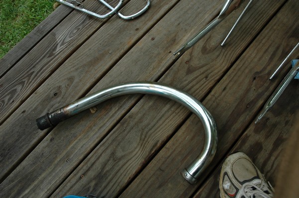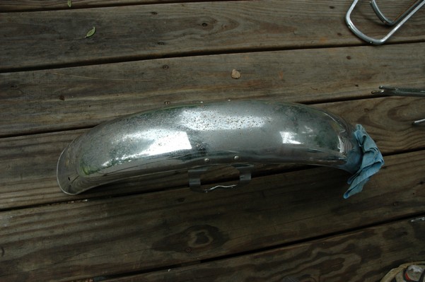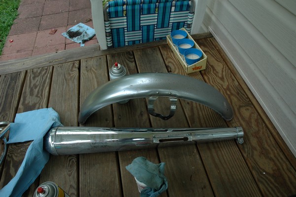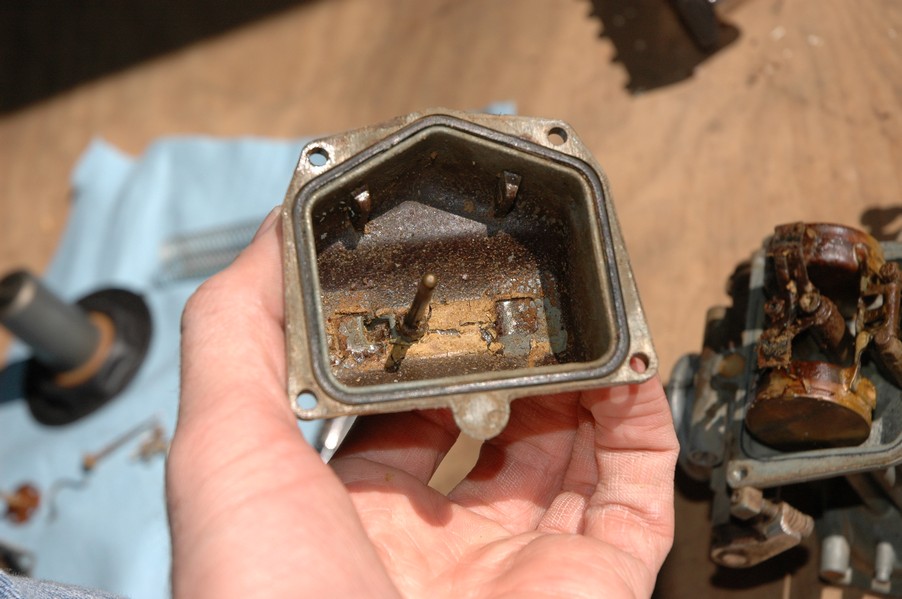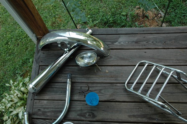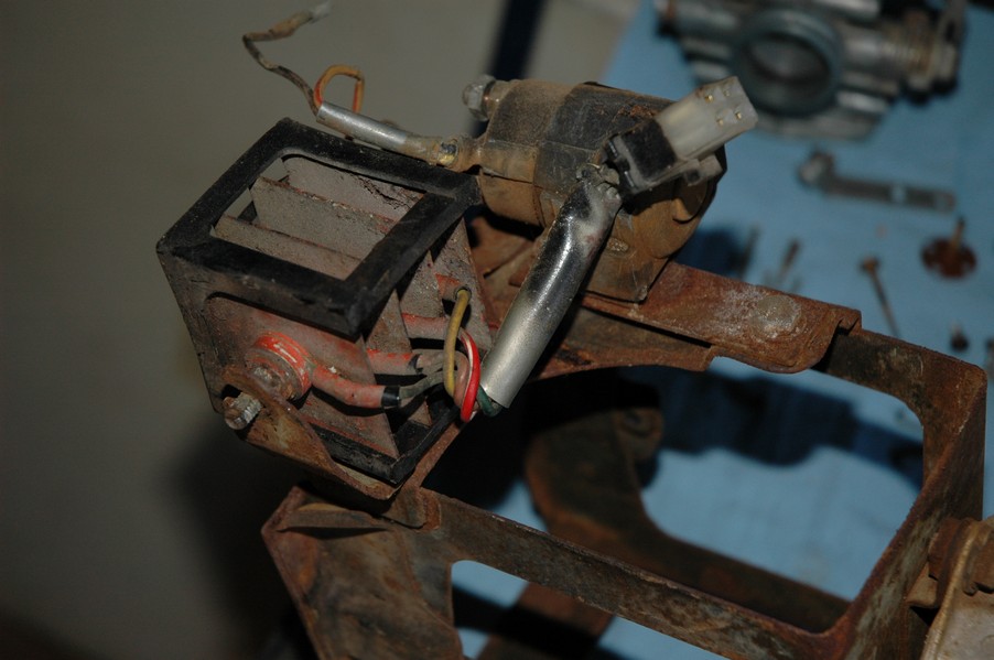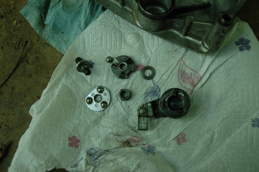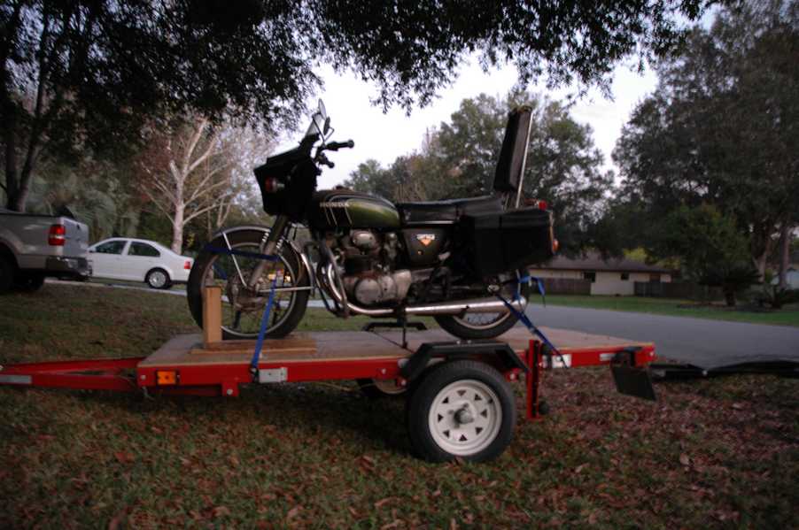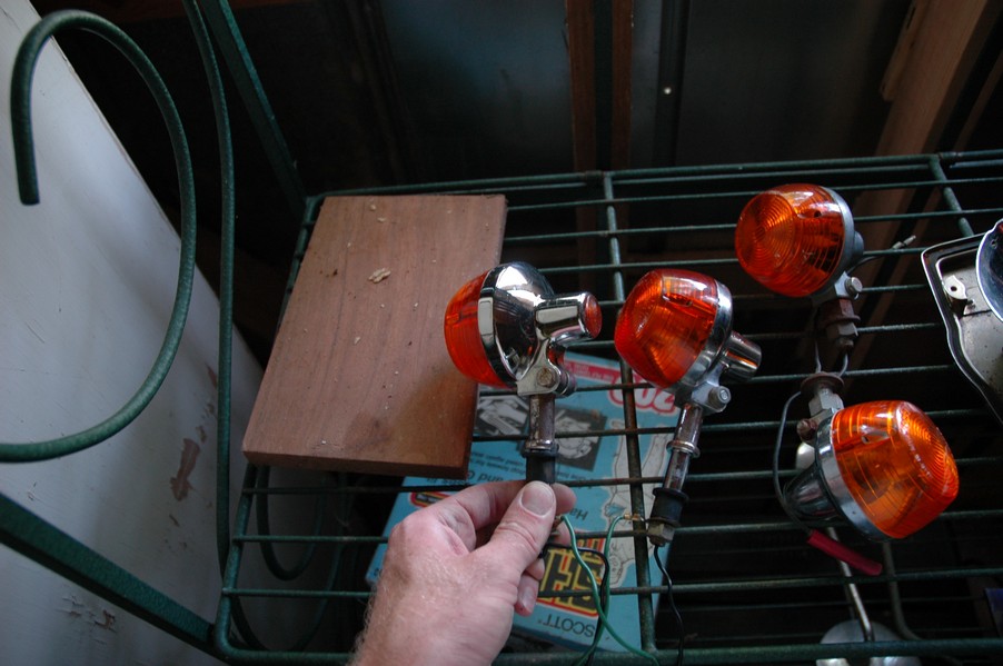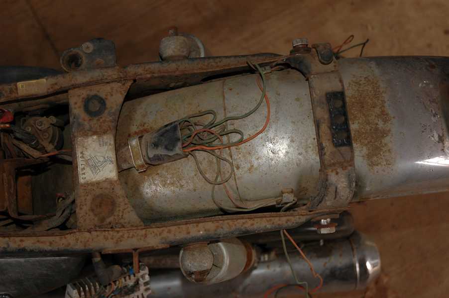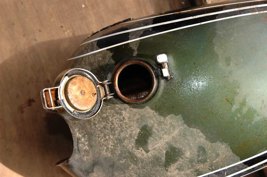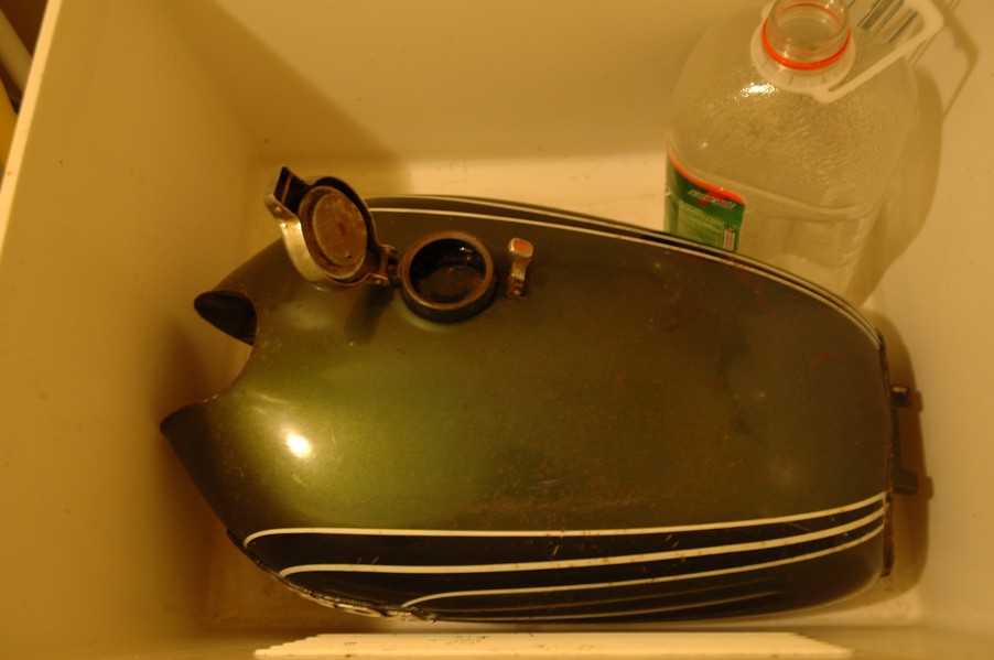 1972 Honda CB350According to honda.com, "Honda dealers sold more than a quarter-million CB350s over the model's five-year run - 67,180 of those in 1972 alone."So here is a 1972, one of the 67180. Thanks to Mark, it's my next project. These are pictures of it that I took when I picked it up. With 23390 miles, this one has seen more riding than the SL175. From what Mark says, I'll be the 3rd owner. This one is more complete than the 175 in some ways, since it does have its original owners manual and toolbox. Since my SL175 has been giving me some trouble, I decided to take a break and work on the CB for a little while. I started by taking off the accessories and giving it a bath. Wow, there was a motorcycle under that faring. In the pictures below you can see that the chrome front fender has some pitting, and of course I've included a picture of the ancient turn signal light bulb. The first owner had trouble with the rectifier, so he put on this aftermarket version. Unfortunately I sheared off the stud when I was taking off the acorn nut that holds on the sissy bar and suspension. I haven't taken it apart further yet to see how complicated the repair is going to be. The aftermarket rectfier looks a little bit recti-fried, so I'm going to try to find an OEM replacement on Ebay. Or is it the voltage regulator? Hmmm... me and lots of other people seem to get the two confused. With the saddle bags off, it is really starting to look like a CB. The sissy bar isn't going to be a part of the restoration, but I have found a luggage rack to put there instead. The seat cover is in rough shape, and so far all that I've found on ebay is a little bit expensive. I've decided to focus on getting it running first, then to worry about the seat cover in phase 2. I guess the battery was a little bit short, so someone put in this 1/4" piece of aluminum and 3/4" pieces of wood to stack it up a little bit higher. Under the owner's manual you can see four Mississippi inspection stickers, ranging from 1974 to 1978. The fuel line had reached it's service life limit some time ago, so it was actually the consistency of uncooked macaroni. If I tried to bend the line it would break off into crispy little pieces. The lever on the petcock is broken off too, which will be something good to fix in the long run. The especially astute reader might have noticed in an earlier picture the tell-tale pool of gasoline varnish on the top cooling fin of the left cylinder. This was actually coming from a leaking fuel tank. It had been repaired before, but the repair doesn't seem to be holding up too well. I'm hoping to use the Kreem products to seal the whole tank, especially since there was quite a bit of rust in the float bowls. Here you can see the original ignition key mounting location, and get a good idea of how dirty the whole frame is. Do you see the pool of varnish yet? Look in the pictures just above. There is a little cricket who is just itching to check it out. Below you can see the wax left on the front end parts, which will hopefully come off fairly easily. The rusted u-bolt is from the crash bar. I guess it wasn't chrome plated like the bar itself was. After all of that work, the bike was ready for a nap. You can see it snoozing and also see how dirty the bottom is. With everything off, you can really start to see some similarity between the CB and the SL175. The fenders are set up differently, and the SL has a double-downtube frame, and of course the exhaust is more like the CB175. The petcock has definitely seen better days. One of the many amenities that the CB has over the SL is the locking seat and helmet hooks. Since they are only accessible from under the locked seat, it gives an option for leaving a helmet in a semi-secure location. The air filters were dirty as I would have imagined, though I suspect they are servicable, which is more than I can say for the powder that I found on the 175. 6-2008 Update- It doesn't appear that it is possible to clean the filters. Replacements are expensive, and hard to find. The side covers have badly oxidized paint on the outside, and I'm hoping that they will look better after some cleaning. There is a rubber balancing tube that goes from one air cleaner to the other. In picture 3 you can see a screw head after removal by drill, and finally the crankcase vent tube (much like all to many other parts) has started reverting to its original ingredients. When I was coasting down the hill from the trailer to the work area, I noticed that the front brake was pretty weak. The back brake was also pretty weak, though mostly because one of the vent tubes was getting in the way of the pedal's travel. In the first picture you can see the squeeze. The last two show a few little wiring problems, though nothing major. Here is more creative wiring, along with a tank strap in pretty poor shape. The good news is that these are being reproduced and are available as new rubber. The rear fender will look a lot better after a rinse and polish, but that's for phase 2. Below in the first picture you can see the worst side of the engine, though I'm not sure where it got exposed to the elements. Maybe the motorcycle was parked under a lean-to, or something like that. The OEM toolkit is in good shape considering the circumstances, though it too could use a bath. The third picture is me trying to give the CB a little motivation by showing how pretty it can be. Hopefully the SL wasn't whispering sweet "engine not runnings" into it's ears. The last photo below is the "before bath" shot. These two are "after the bath" shots, and you can see a large difference. Photo 3 shows the degree of insect infestation in the cooling fins of the engine. The SL had the same problem. The last phot shows where the OEM turn signals will mount, along with the black headlight bucket. It will take some research to see if that is the stock color. The SL uses blue to match the tank and side covers. The last two pictures are espe