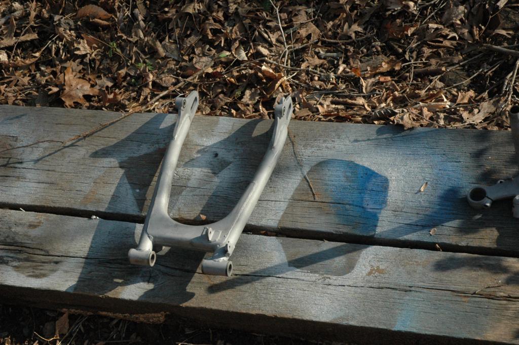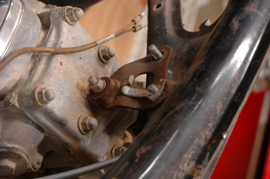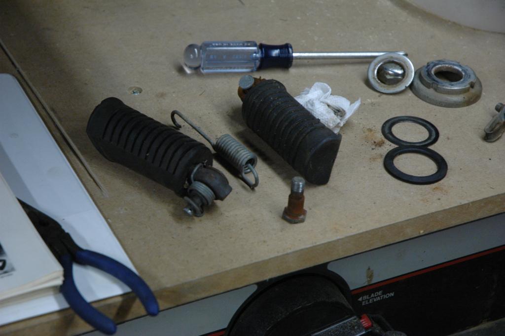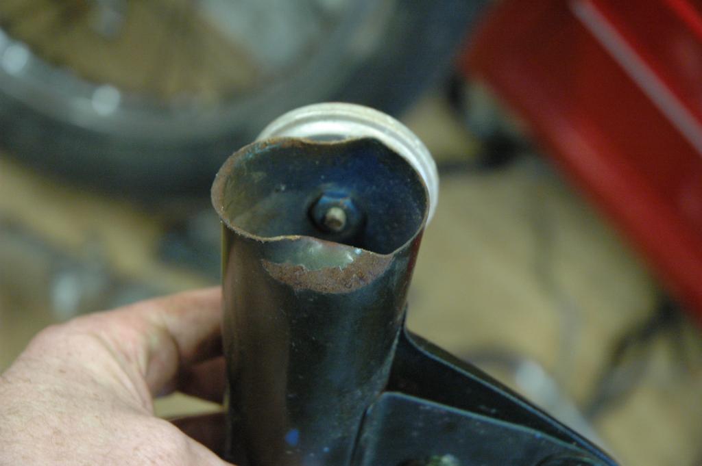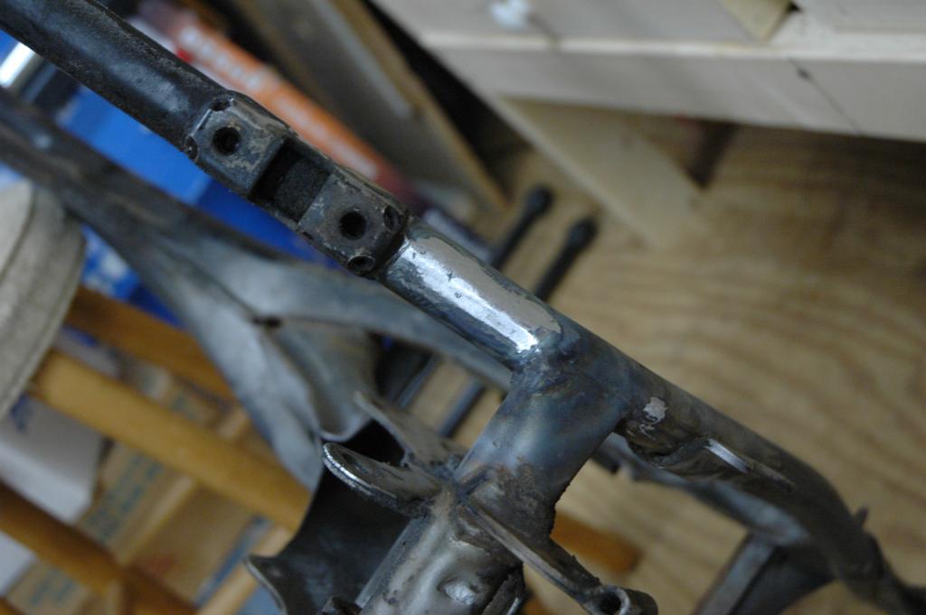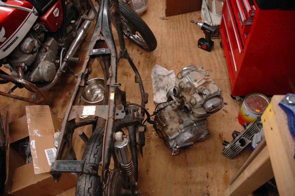 CB350 Part 3It has been a while since I've added an update to the green CB350, and some of these pictures are pretty old. The last edition ended with disassembly of the frame in anticipation of some repairs and refinishing. The first few pictures below are documentation for reconstruction. The last picture shows the engine coming out.The next sequence of pictures shows how to remove the frame data plate that seems to be common on most of the honda motorcycles from the early 1970s. The first picture shows the data plate in question. The second picture shows an automatic center punch that I used to put a dimple in the center of the rivet head for drilling. A regular center punch would work also, but I had one of these handy. The punch mark helps keep the drill bit centered. The idea is to drill just enough to get close to separating the head of the rivet, not to try and drill all the way through. Picture number three below sort of shows that. Once the head is weakened, it is easy to remove it by sticking the back end of the drill bit into the hole and applying a slight bending pressure to pop the head off. Picture 4 below shows the rivet heads removed. The plate is still glued to the frame, and it is made of very thin and soft metal. I applied gentle heat from a heat gun and was able to pry the plate off without any bending. You can see the results in the 5th picture below. I took the steering head apart and removed the bearings, which required a special tool. It just so happens that I had a prior project (Honda Lawn Mower Clutch) that required that same tool. In that case, I just made one out of a socket and a dremel tool. If you plan to do the same, just measure the inside diameter of the desired finished teeth, then go to the cheap tool store and find a socket with that same inner diameter. It was pretty easy to grind away everything except for the four legs that fit into the steering nut. I'm not sure how the green piece got bent in the first picture. I have another set of these that are in better shape that I'll probably use on the reassembly. The second picture shows the view after I unscrewed the special steering nut. After I removed all of that stuff, I turned the frame up on end and dumped out a huge pile of rust flakes, dirt, and grass bits. You can see the results in the first picture below. The second image below shows one of the cracks in the bottom of the frame. The third picture below shows a spot on the bottom of the frame where the metal was just gone, probably from a combination of corrosion and damage. The fourth picture shows a big fat paint run on the swingarm. The funny thing is that I'm not really sure if this is the way it came from the factory, or if someone has already repainted the swingarm. I wouldn't be surprised by either- these bikes were made pretty cheaply from the start. The first two pictures below are just more shots of the condition of the frame and the location of some of the damage. The second two pictures show the repair of the crack that I mentioned above. I used a sandblaster to clean the area, and then used a dremel to cut the crack area out. In retrospect, I could have just welded the crack shut and it wouldn't have been any worse. I was still learning how to weld, so it isn't perfect. The fifth picture below shows the final result after touching up. The middle pictures in the second row show a before and after view of the bonus welding rod blobs that came from the Honda factory. This is a great way to tell if the frame paint is original, and also a great example of why I don't really get caught up on the whole originality thing. If you are looking at a supposedly original honda that has a perfect frame with no weld blobs or paint problems, be suspicious. The last picture in the second row is a before and after picture of the blasting process. I used glass beads with a cheap pressure tank blaster from China. It lasted long enough to do this one project. The first picture below shows more of the stuff that I dumped out of the frame. In the second picture you can see some soap sudds that were part of the scrubbing process. The third picture is of the tripple tree after electrolysis. The last picture is my make-shift blasting area. The cardboard box is there to hold a trash bag, which collects the blasting media. I reused the media from the bag after sifting it through a screen. I wanted to have the frame powder coated for durability, so I didn't finish blasting the frame. It cost $150 to have them blast and coat the frame, so it was well worth it. There are lots of other little steel pieces associated with the frame, and I wanted to refinish those on my own. The next series of pictures show that process. I used a spray-can epoxy frame paint that is sold with the purpose of painting motorcycle parts. After I had a beautiful new looking tripple tree I realized that I had used the wrong one. It turns out that there is a difference between the 1972 and 1970 year models on this part. The first picture below shows the differences. The second picture shows the results of filtering the rusty water from the electrolysis process, but I'm not sure why it ended up here. The third picture is of the center stand, and it is another great example of the sloppy OEM welding. The shiny spot is one area that I've already ground. These little knobs come right off, since they aren't very thouroughly welded. The other pictures are just more pictures of the prep and paint process. I had already painted some of the pieces, but wanted to try for a smoother finish, so I sanded them with fine wet sandpaper and repainted them again. The first picture below is of the footpeg bar and the kickstand. The rest of the pictures are of the swingarm bearings. I call them bearings, but they might be more appropriately called bushings. The second picture shows them in the "as removed" nasty stage, and the others are after cleaning. The shorter tube is the attach for the center stand. The