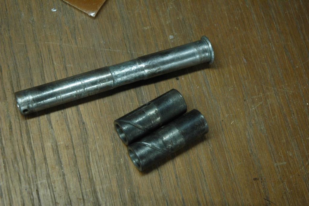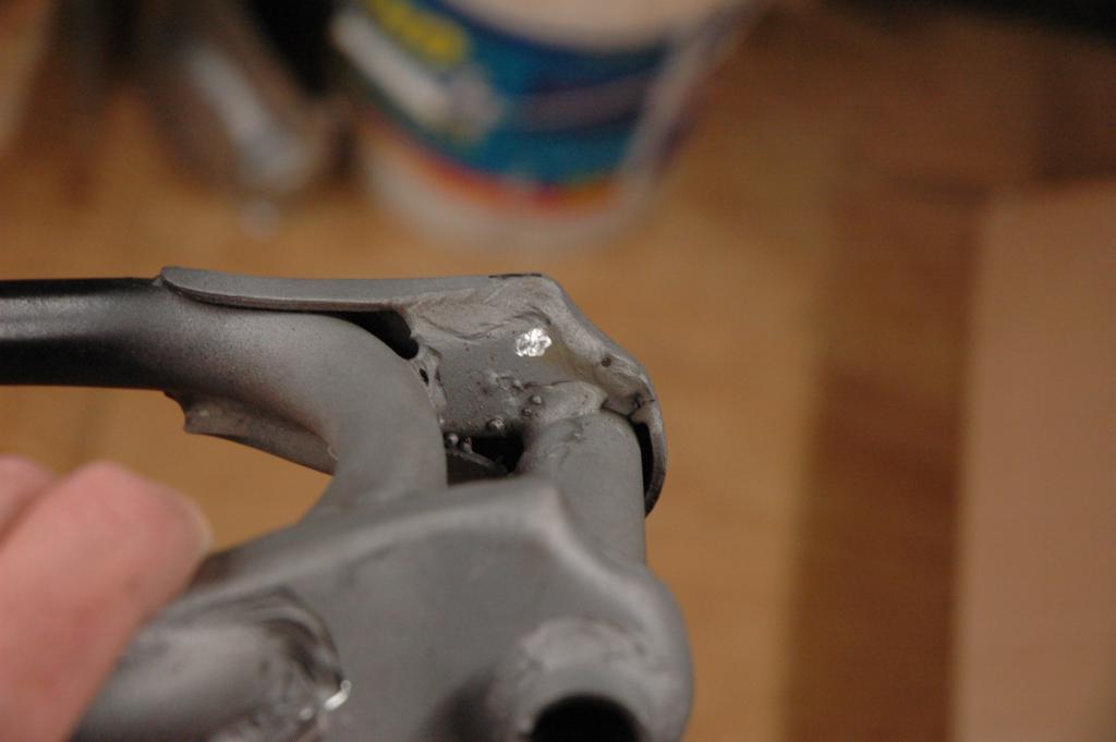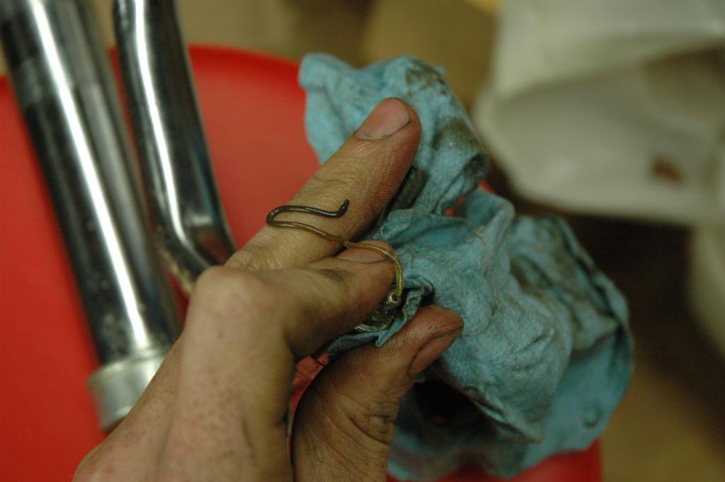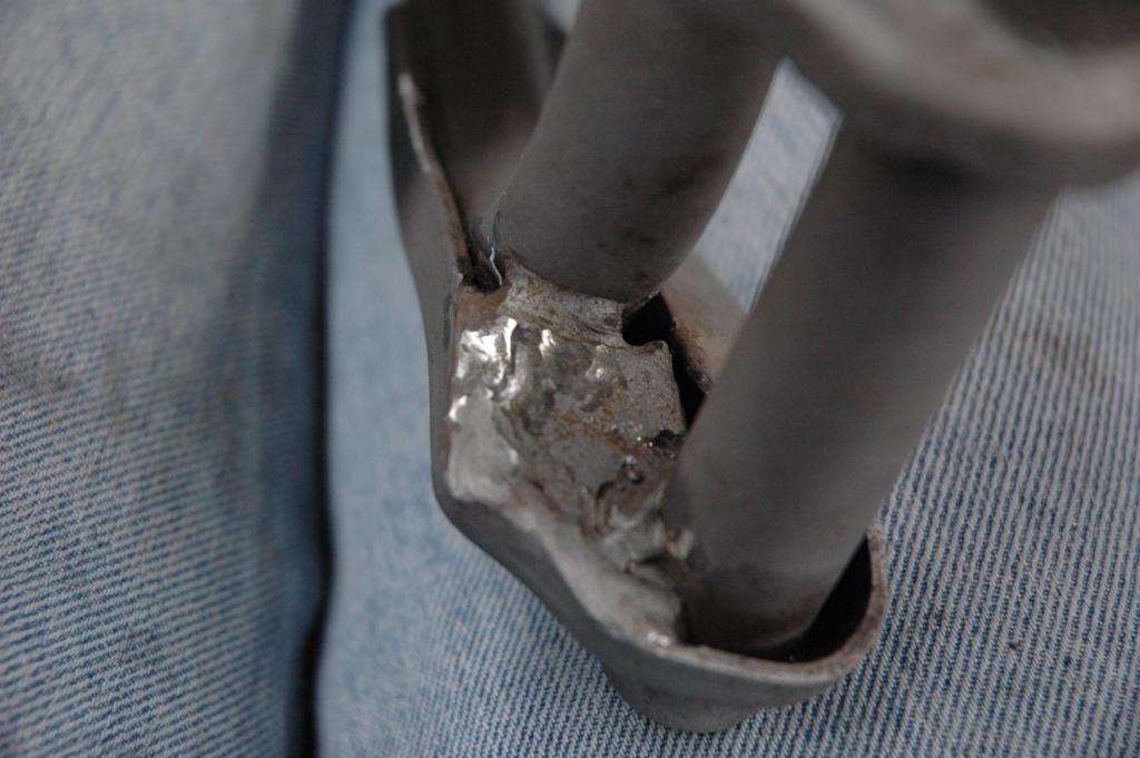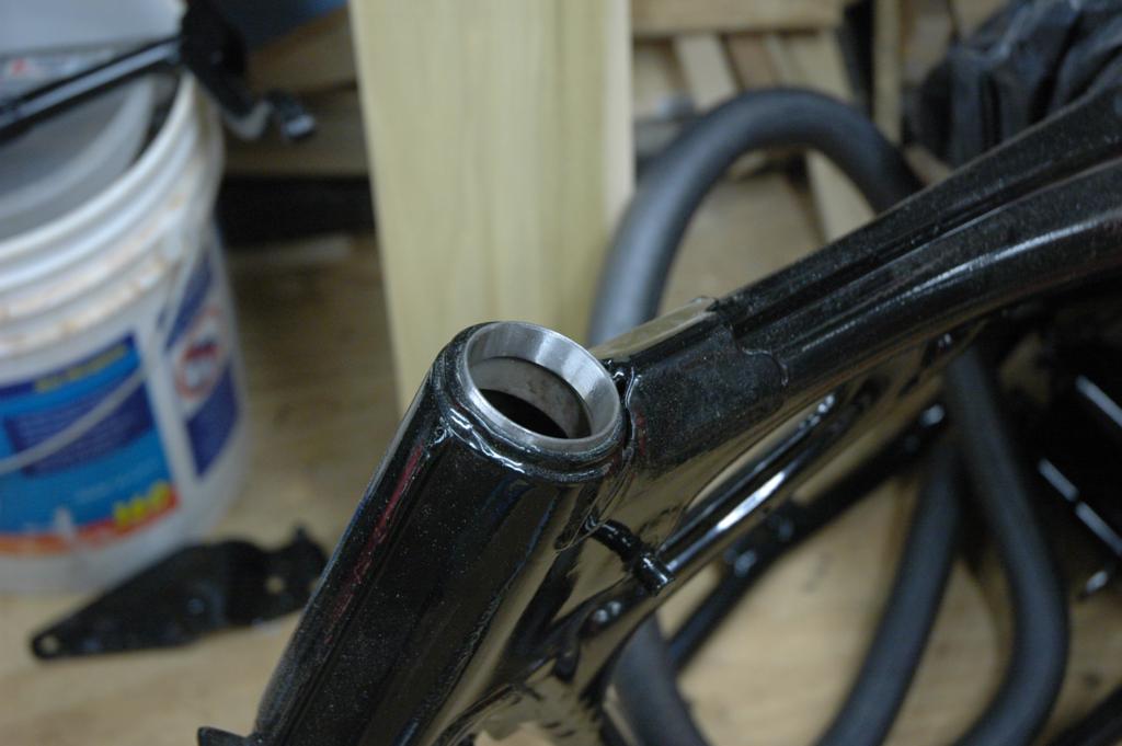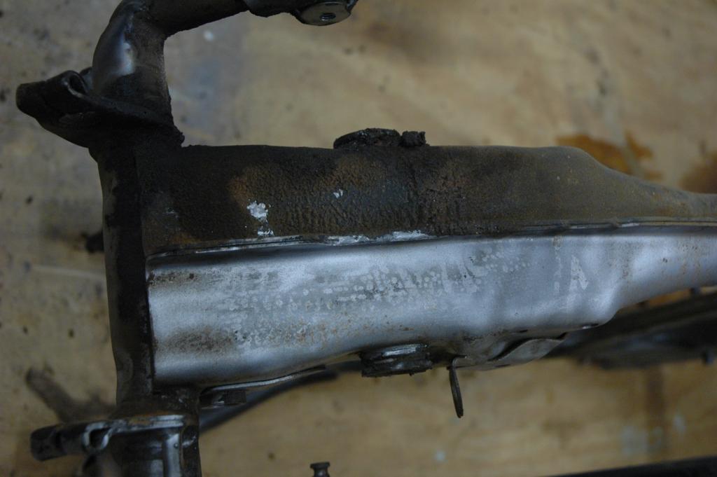 CB350 Part 3It has been a while since I've added an update to the green CB350, and some of these pictures are pretty old. The last edition ended with disassembly of the frame in anticipation of some repairs and refinishing. The first few pictures below are documentation for reconstruction. The last picture shows the engine coming out.The next sequence of pictures shows how to remove the frame data plate that seems to be common on most of the honda motorcycles from the early 1970s. The first picture shows the data plate in question. The second picture shows an automatic center punch that I used to put a dimple in the center of the rivet head for drilling. A regular center punch would work also, but I had one of these handy. The punch mark helps keep the drill bit centered. The idea is to drill just enough to get close to separating the head of the rivet, not to try and drill all the way through. Picture number three below sort of shows that. Once the head is weakened, it is easy to remove it by sticking the back end of the drill bit into the hole and applying a slight bending pressure to pop the head off. Picture 4 below shows the rivet heads removed. The plate is still glued to the frame, and it is made of very thin and soft metal. I applied gentle heat from a heat gun and was able to pry the plate off without any bending. You can see the results in the 5th picture below. I took the steering head apart and removed the bearings, which required a special tool. It just so happens that I had a prior project (Honda Lawn Mower Clutch) that required that same tool. In that case, I just made one out of a socket and a dremel tool. If you plan to do the same, just measure the inside diameter of the desired finished teeth, then go to the cheap tool store and find a socket with that same inner diameter. It was pretty easy to grind away everything except for the four legs that fit into the steering nut. I'm not sure how the green piece got bent in the first picture. I have another set of these that are in better shape that I'll probably use on the reassembly. The second picture shows the view after I unscrewed the special steering nut. After I removed all of that stuff, I turned the frame up on end and dumped out a huge pile of rust flakes, dirt, and grass bits. You can see the results in the first picture below. The second image below shows one of the cracks in the bottom of the frame. The third picture below shows a spot on the bottom of the frame where the metal was just gone, probably from a combination of corrosion and damage. The fourth picture shows a big fat paint run on the swingarm. The funny thing is that I'm not really sure if this is the way it came from the factory, or if someone has already repainted the swingarm. I wouldn't be surprised by either- these bikes were made pretty cheaply from the start. The first two pictures below are just more shots of the condition of the frame and the location of some of the damage. The second two pictures show the repair of the crack that I mentioned above. I used a sandblaster to clean the area, and then used a dremel to cut the crack area out. In retrospect, I could have just welded the crack shut and it wouldn't have been any worse. I was still learning how to weld, so it isn't perfect. The fifth picture below shows the final result after touching up. The middle pictures in the second row show a before and after view of the bonus welding rod blobs that came from the Honda factory. This is a great way to tell if the frame paint is original, and also a great example of why I don't really get caught up on the whole originality thing. If you are looking at a supposedly original honda that has a perfect frame with no weld blobs or paint problems, be suspicious. The last picture in the second row is a before and after picture of the blasting process. I used glass beads with a cheap pressure tank blaster from China. It lasted long enough to do this one project. The first picture below shows more of the stuff that I dumped out of the frame. In the second picture you can see some soap sudds that were part of the scrubbing process. The third picture is of the tripple tree after electrolysis. The last picture is my make-shift blasting area. The cardboard box is there to hold a trash bag, which collects the blasting media. I reused the media from the bag after sifting it through a screen. I wanted to have the frame powder coated for durability, so I didn't finish blasting the frame. It cost $150 to have them blast and coat the frame, so it was well worth it. There are lots of other little steel pieces associated with the frame, and I wanted to refinish those on my own. The next series of pictures show that process. I used a spray-can epoxy frame paint that is sold with the purpose of painting motorcycle parts. After I had a beautiful new looking tripple tree I realized that I had used the wrong one. It turns out that there is a difference between the 1972 and 1970 year models on this part. The first picture below shows the differences. The second picture shows the results of filtering the rusty water from the electrolysis process, but I'm not sure why it ended up here. The third picture is of the center stand, and it is another great example of the sloppy OEM welding. The shiny spot is one area that I've already ground. These little knobs come right off, since they aren't very thouroughly welded. The other pictures are just more pictures of the prep and paint process. I had already painted some of the pieces, but wanted to try for a smoother finish, so I sanded them with fine wet sandpaper and repainted them again. The first picture below is of the footpeg bar and the kickstand. The rest of the pictures are of the swingarm bearings. I call them bearings, but they might be more appropriately called bushings. The second picture shows them in the "as removed" nasty stage, and the others are after cleaning. The shorter tube is the attach for the center stand. The