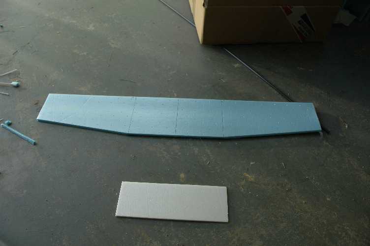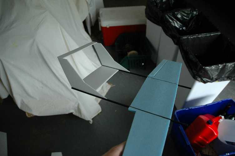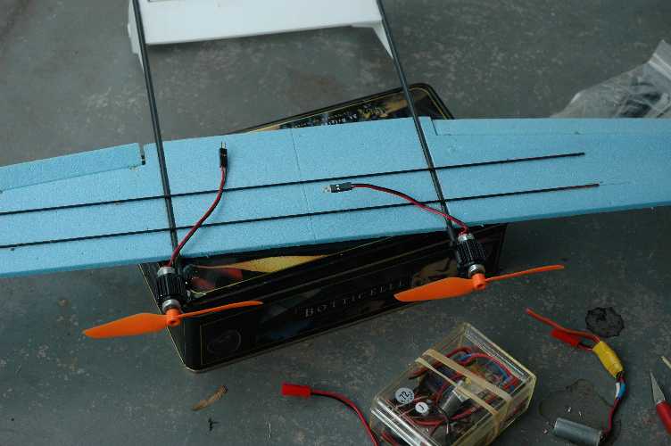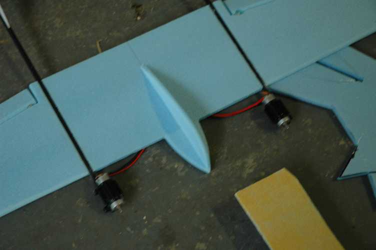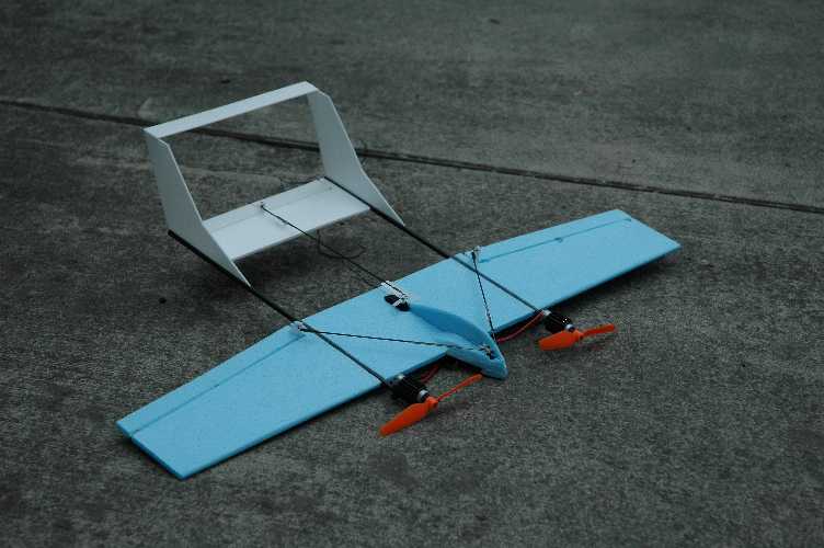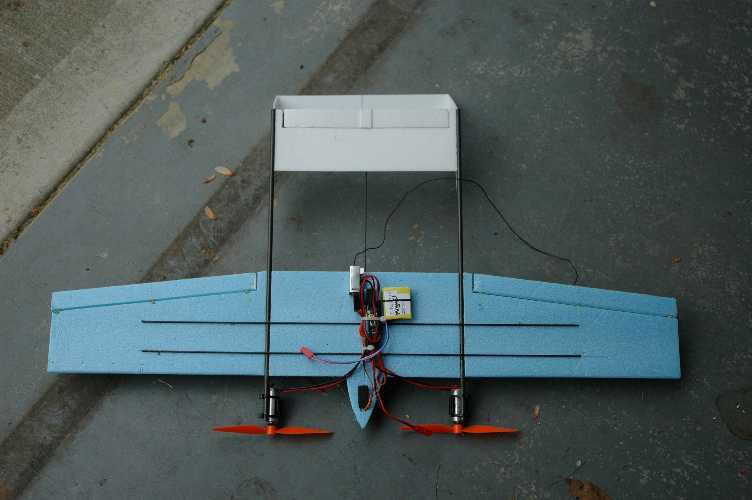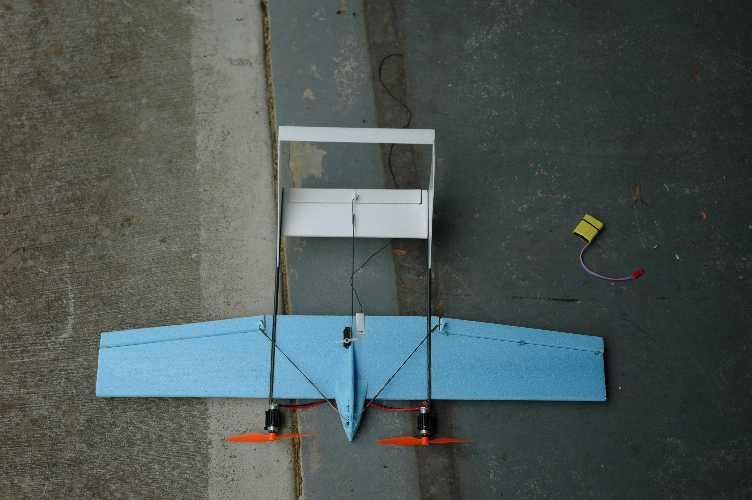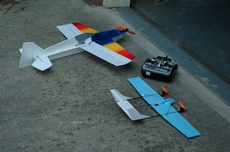 Here is a recent design of my own. It is loosely based on a P-38, so I call it a Q-38. I wanted to be able to use 3/16" carbon rods for fuselage tubes, and IPS direct-drive motors for propulsion. I also expected to use my 250mAh Etech Lithium Polymer batteries, but in the end the motors drew too much current. Instead I used a 700mAh 2-cell pack. It has a 24" wingspan, since the wing is made to the width of a sheet of fan-fold foam. With the 700 pack it flies well, tracking nicely and I was especially pleased with the speed and manuverability. The only draw-back is to be expected, and that is a fast landing speed. The wing loading is a little bit high, so the bottom end of its speed envelope is pretty high. This problem leads to a minor design flaw that results in a lot of broken props. I think some kind of landing gear or support under the fuselage stick would help solve this problem.This is the Extra 300 from 3dFoamy.com plans. I've modified it to change to a built-up sort of structure. The tail feathers and fuselage are 1mm depron, while the wing skins are 3mm. I haven't had a chance to weigh the parts yet, but the airframe certainly looks better than the shock-flier setup. There is a single 3/16" carbon rod for a wing spar, and the rest of the airplane is only foam. I used medium-sized hinges with hinge pins to help make for very free control surfaces. Hopefully I'll have enough servos to put a separate servo in each wing, so that I can come up with some aileron and flap mixing. The blue-foam spars seem to make for a structure that is very twist resistant.