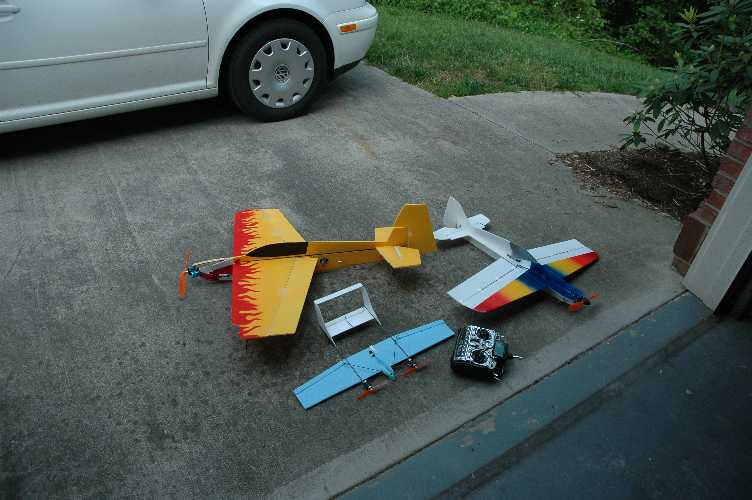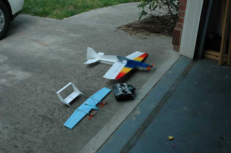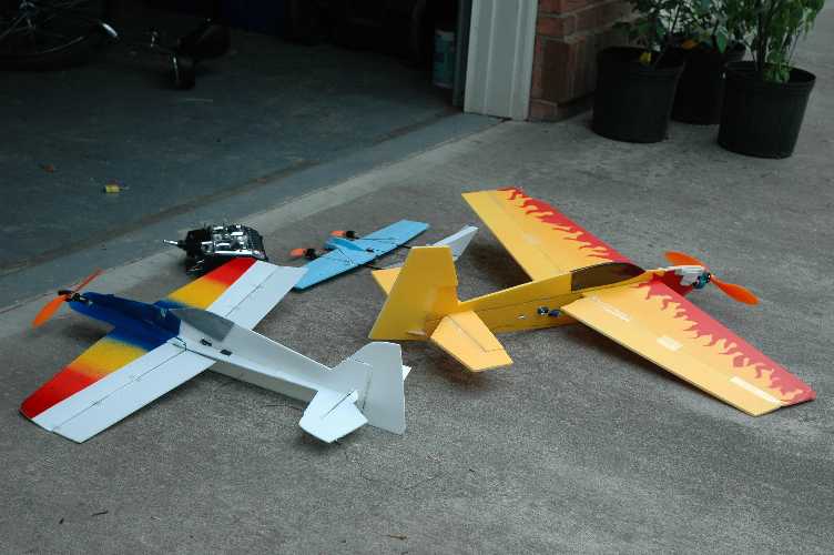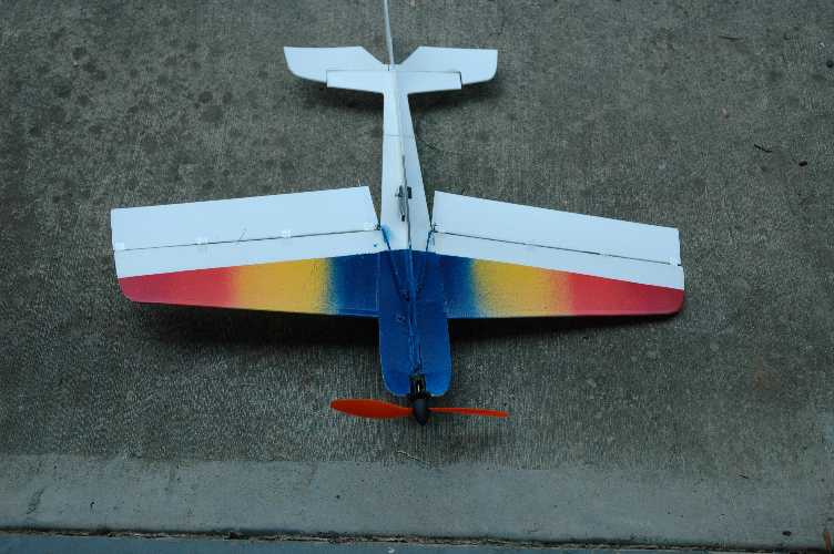 Here are some pictures of the rest of my current fleet. The rainbow one is a mini 3DX. It currently has an IPS motor, but I'm in the process of upgrading it to an IPS twin for better power. It is a blast to fly because it tracks so well. I built it in a hotel in Lafayette, LA about 2 years ago. It has had some long sits in the hot car and is a little bit warped, but from the way it flies, you would never know. The paint is testors, and the scheme helps keep the colored side up when flying at dusk. It has kevlar thread pull-pull linkages for the tail, and balsa-stick pushrods for the ailerons. Last time I weighed it gross weight was around 7 ounces.