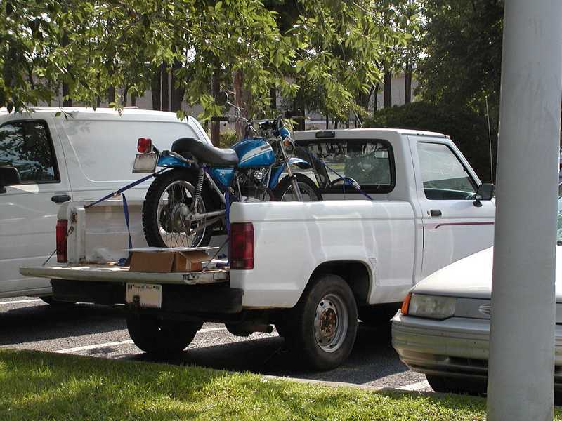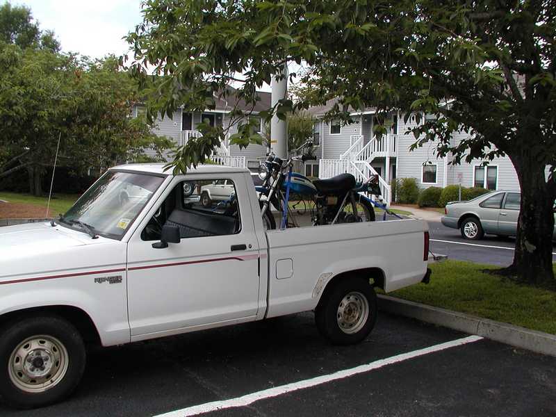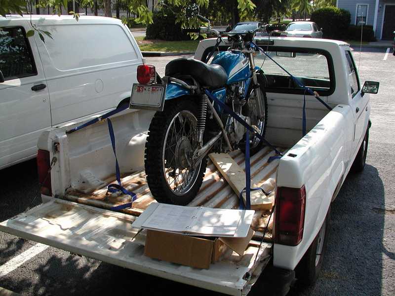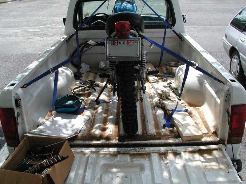 Since my new storage place doesn't have much room, I decided to remove the engine with the bike in the back of my new truck. It turned out to be a really handy way to work. It elevated the bike to a more ergonomic level, it gave me places to put parts and tools other than the ground, and the straps helped stabilize things. The engine on this bike weighs about 80 pounds, and the bike weighs about 250. Since that is such a large portion of the weight of the bike, having the bike solidly held in place by the straps made it much easier to wrestle the engine around without having to worry about the bike moving around.