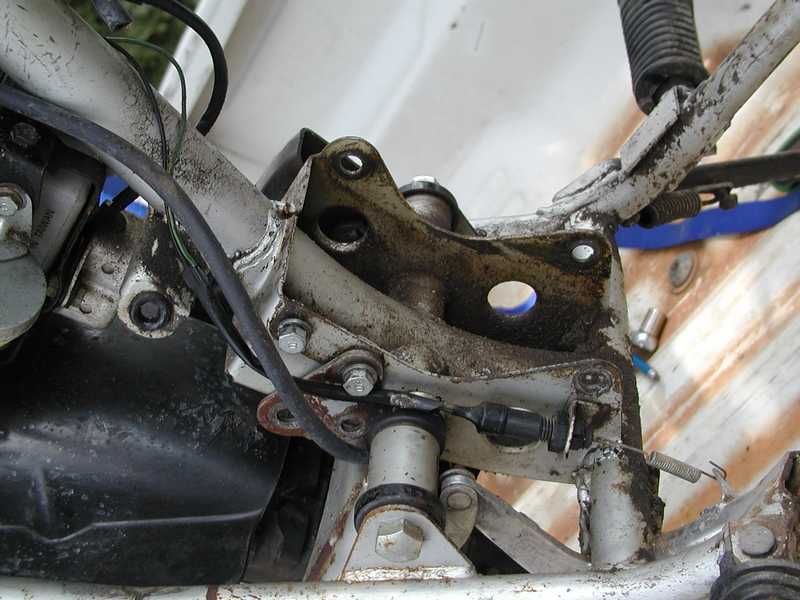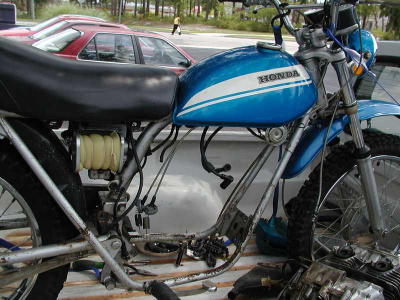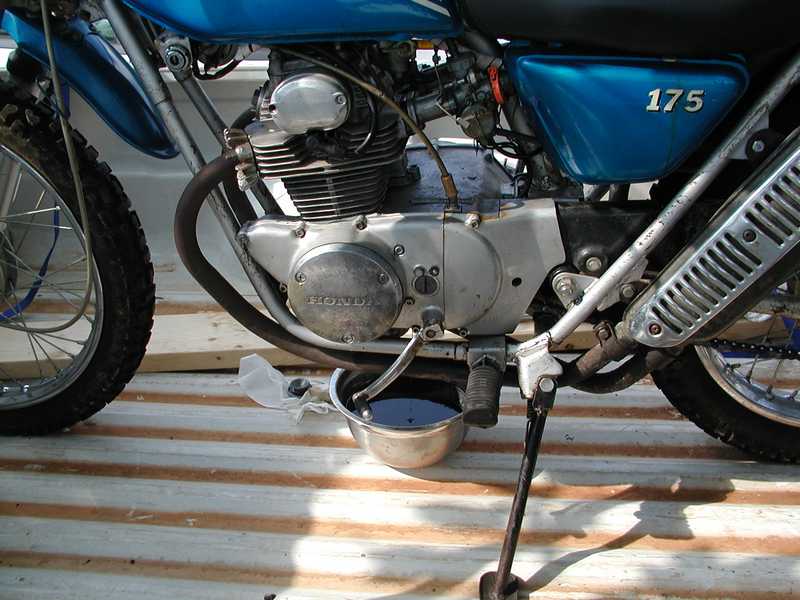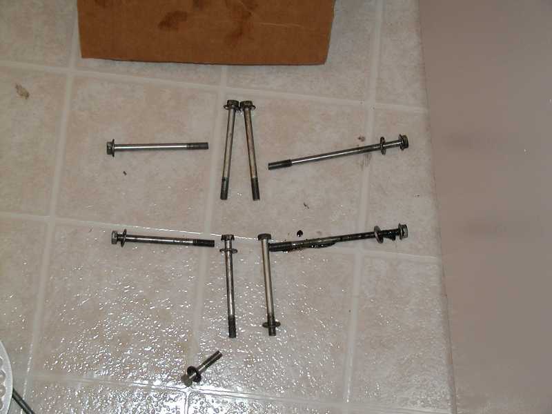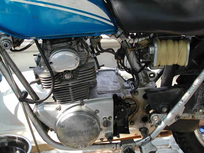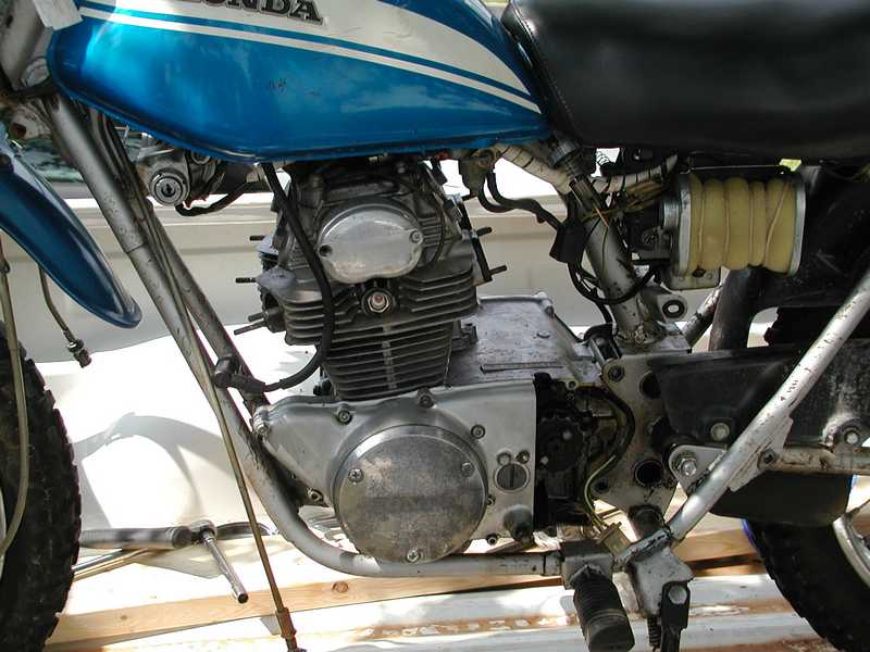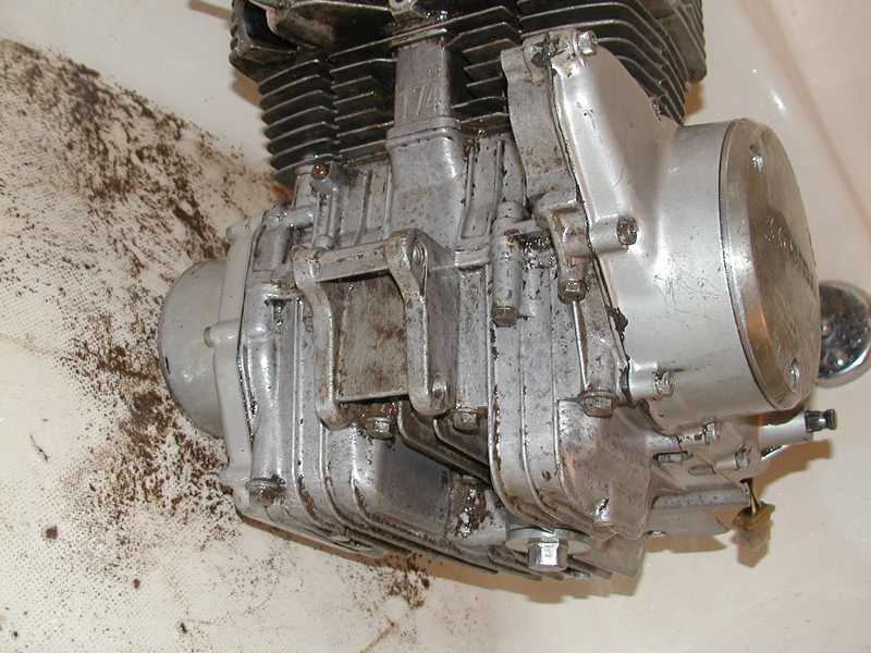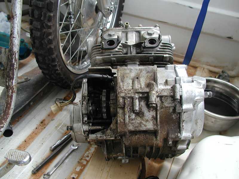 I followed the steps in the overhaul manual for preparing to remove the engine, with the exception of not removing the fuel tank. That involves draining the tank, which sounded troublesome. First, I disconnected the battery. I removed the side covers, the chain, the final drive cover, the exhaust, the carbs, the clutch cable, the ignition wires, and most of the bolts. It really isn't more than a 1 hour job or so to get the engine ready for removal.