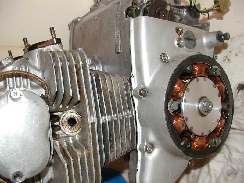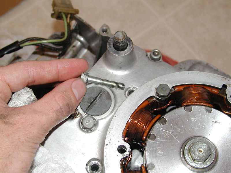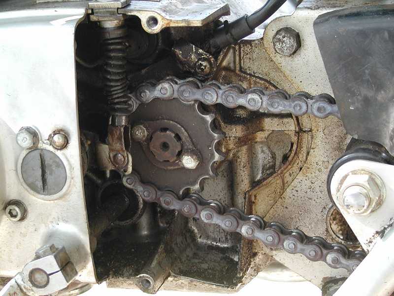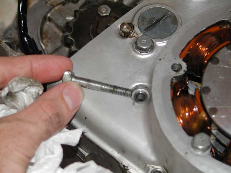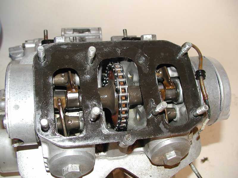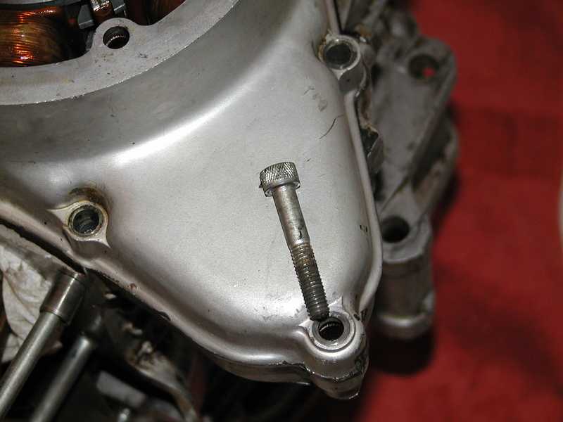 I had to remove the generator cover next so that I could get access to turn the crank over. This makes it much easier to find the master link in the cam chain. The last picture on this row shows the link in position for removal.