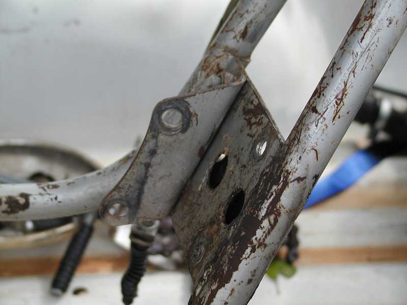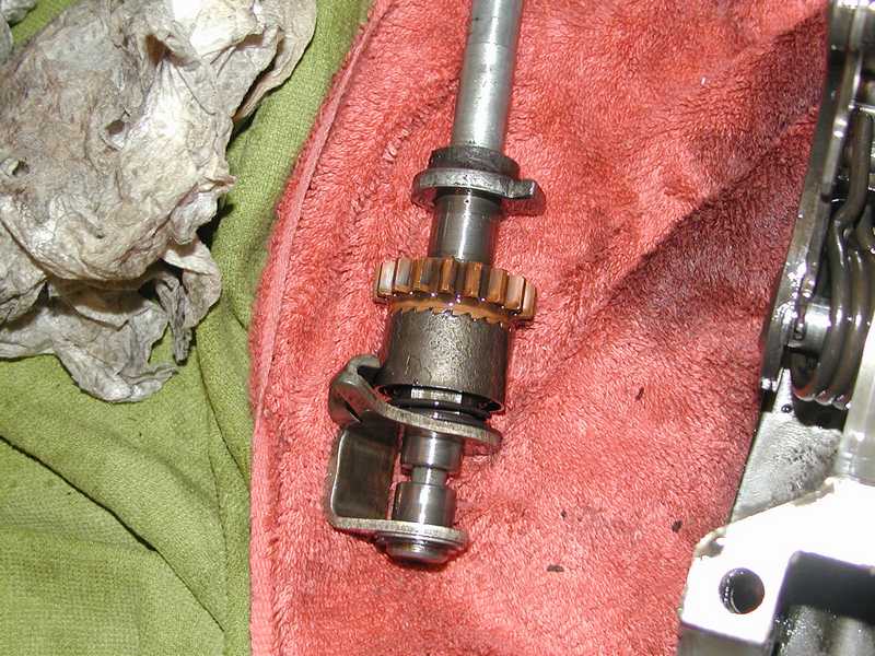Here is a picture of the worn kick start parts. Look at the union where the bronze-colored pinion meets the cast piece. The teeth are rounded off, leading to occasional slipping. These parts may prove to be hard to find, though hopefully I'll get lucky and find some in good shape.