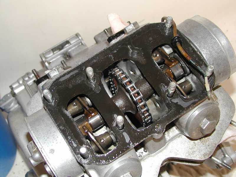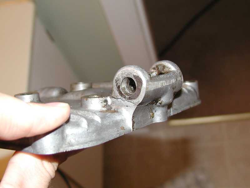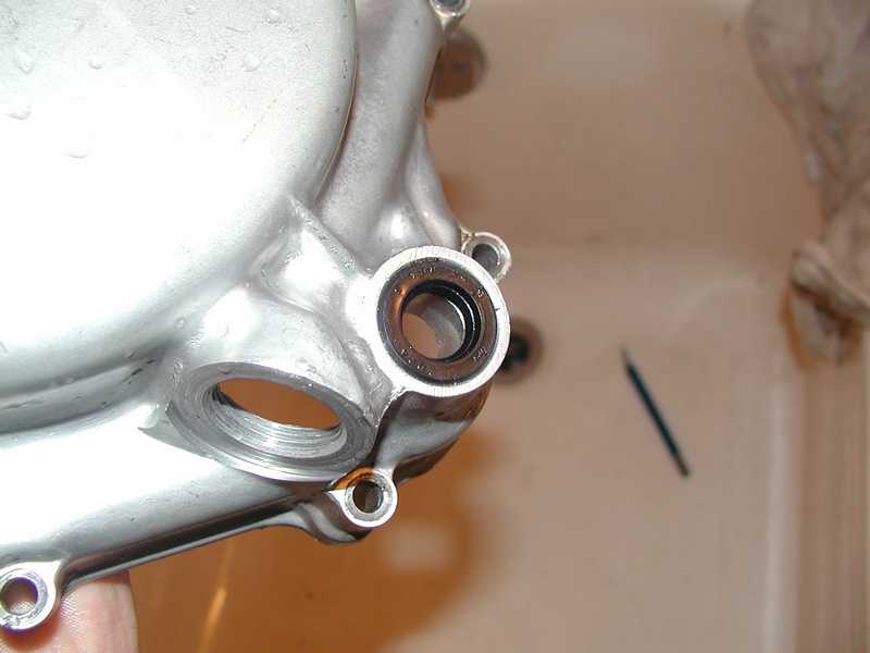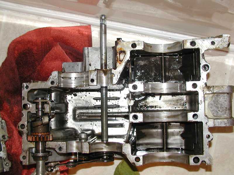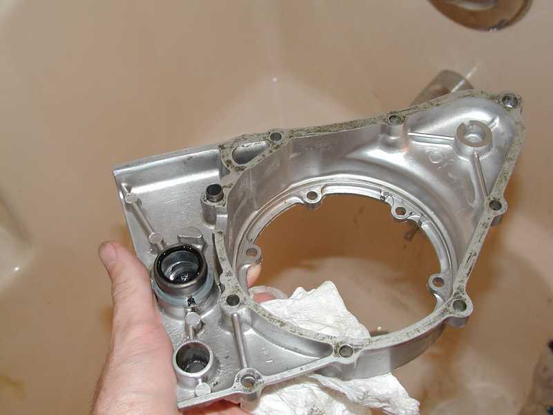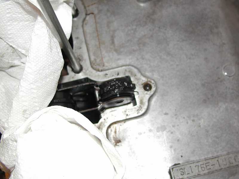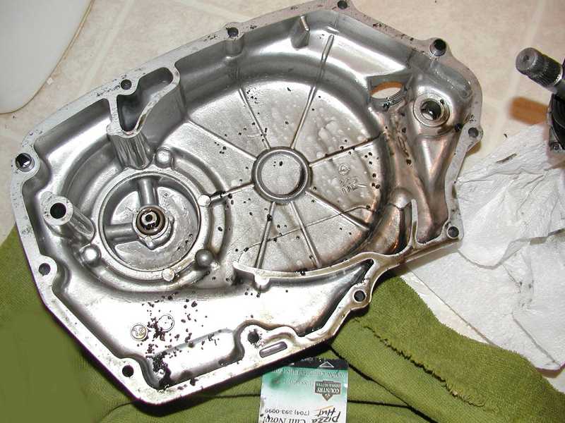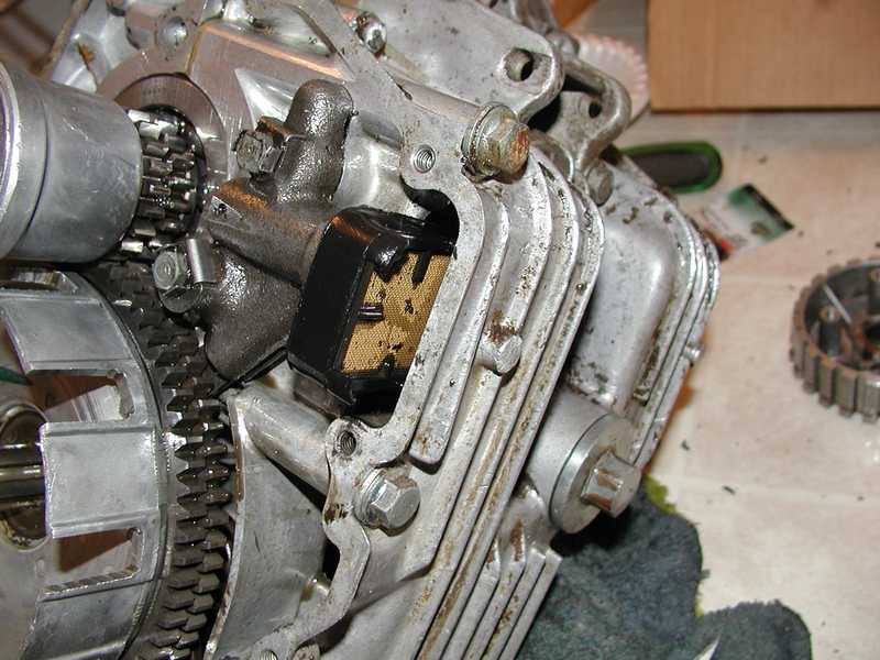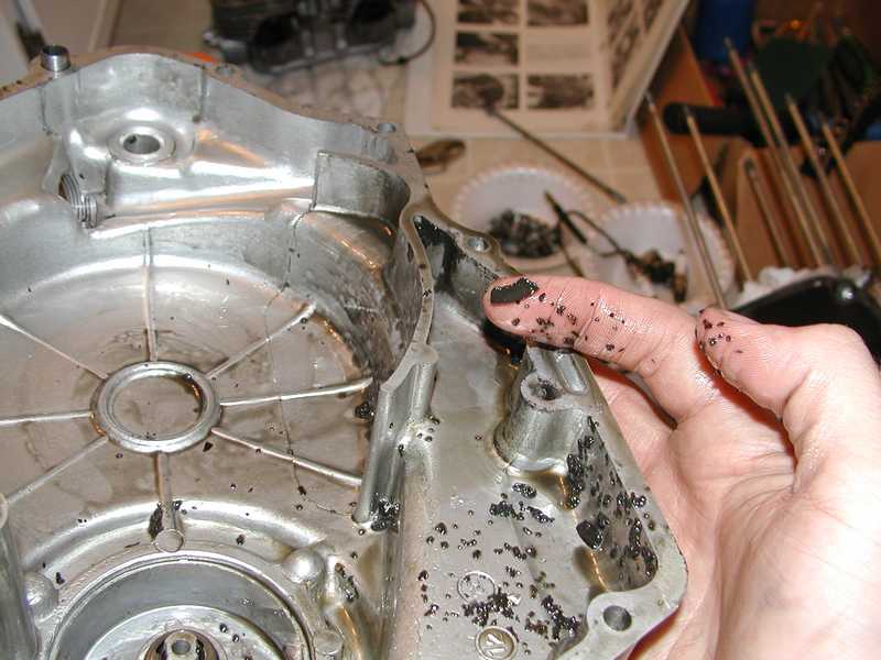 The right side cover is part of the oil sump, unlike the left. Click on one of the thumbnails to see little bits of the cam chain tensioner idler. Luckilly it was plastic, so that the little pieces don't hurt anything. I'm not sure how long they've been floating around in there, but it will be good to get them out. I guess they could be capable of plugging up some sort of little oil passage.