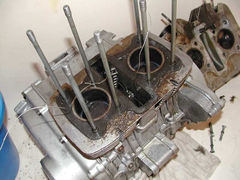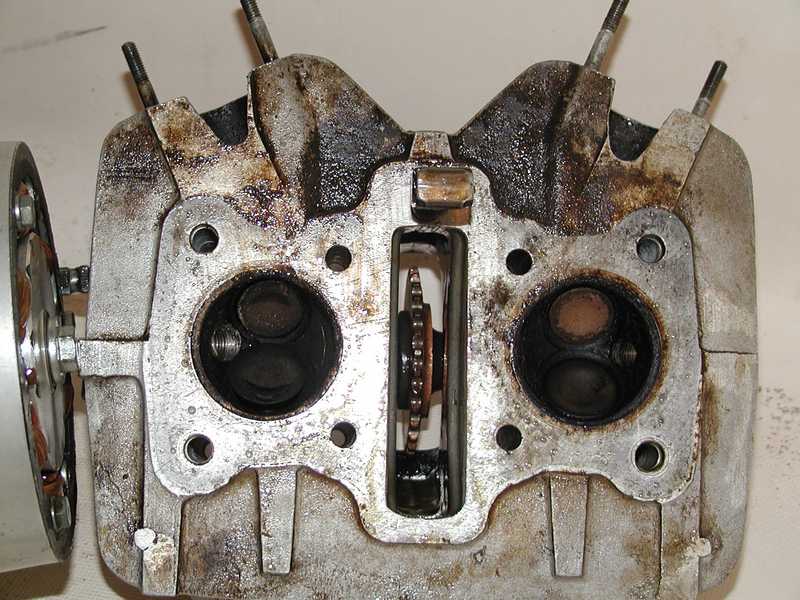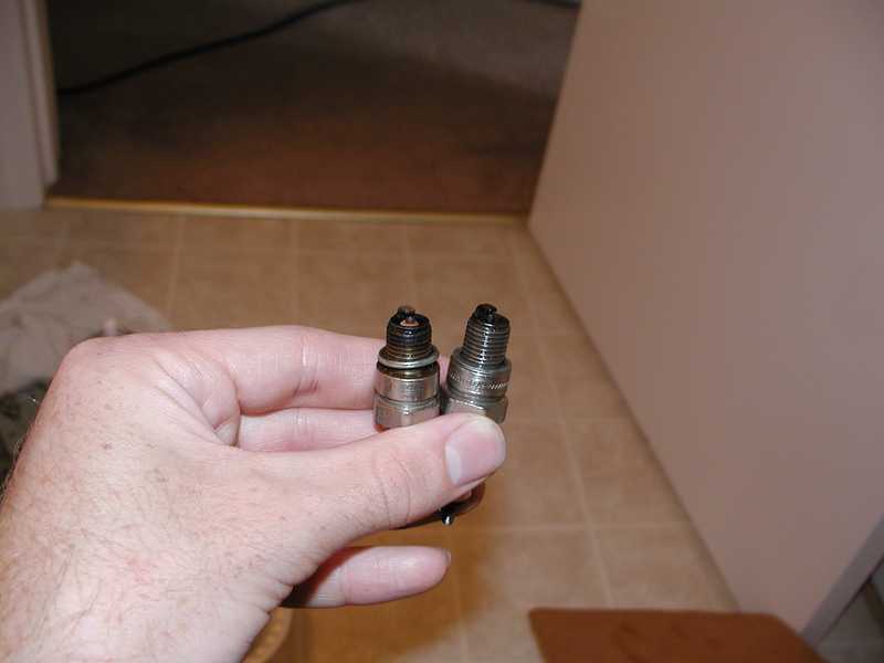 With most of the dirt out of the way, I started at the top by removing the bolts that hold on the cylinder head cover. On mine one of the studs came loose instead of the nut, but that wasn't the end of the world. The interior of the engine was in pretty good shape. There was just a little bit of rust on the rocker arms. You can see the difference in the two spark plugs. They are indicating the problem with the right cylinder running rich. You can see the black color of the right plug vs the nice brown color of the left.