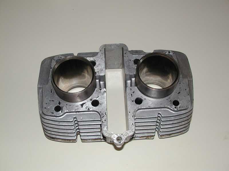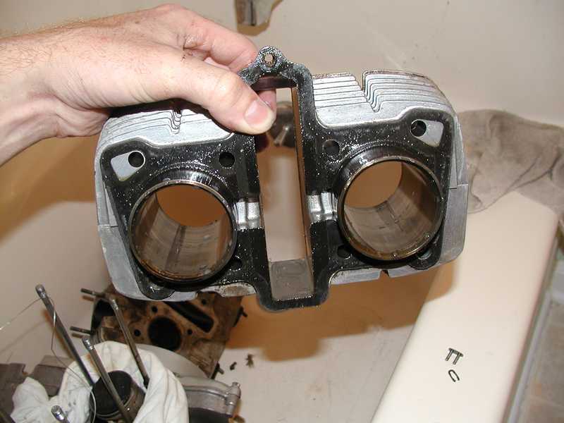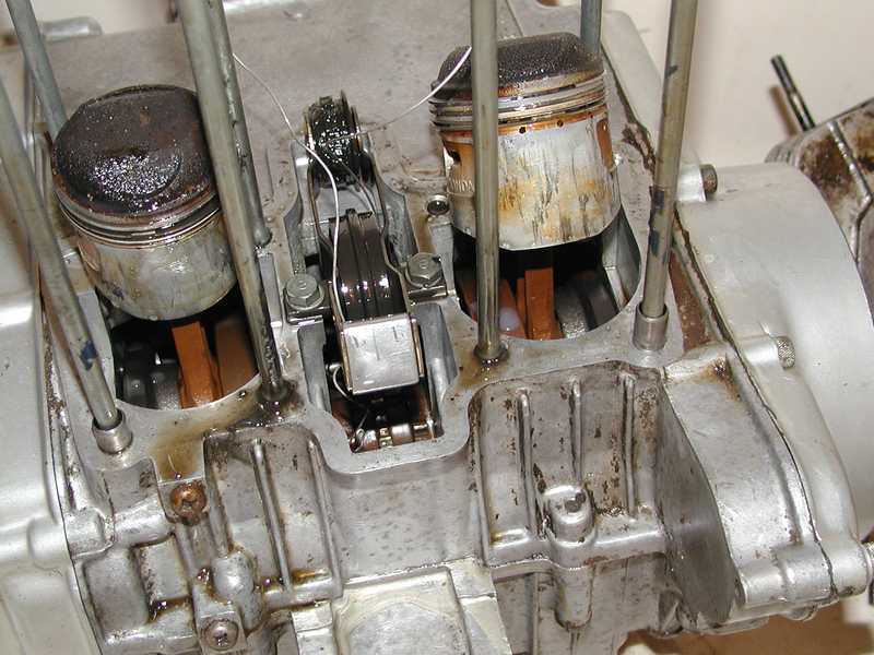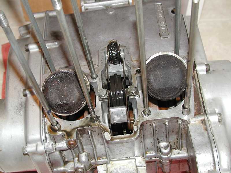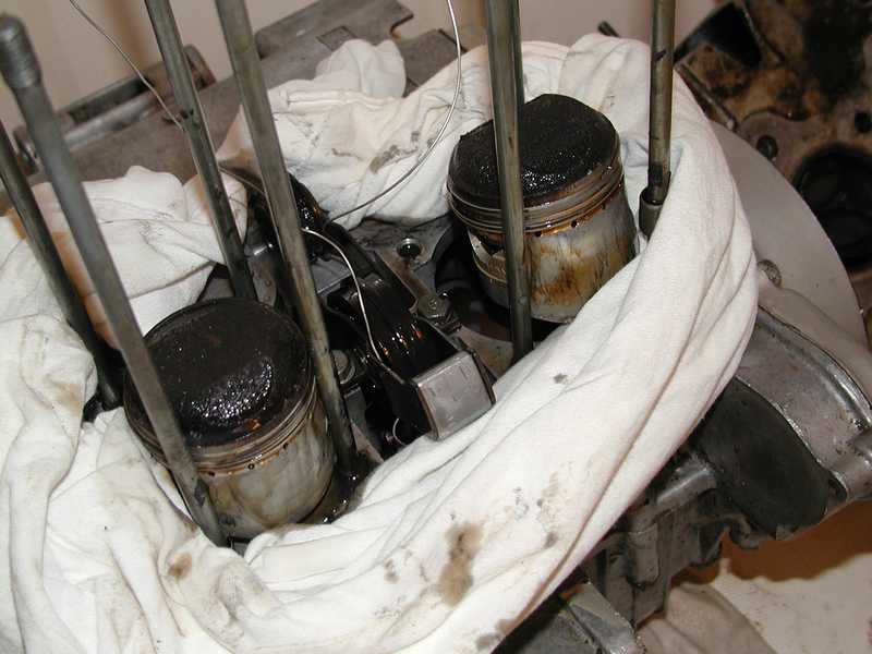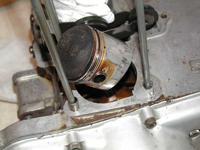 With the cam chain disconnected, removing the head was just a matter of lifting the whole assembly away. I turned it over, set it down, and took the first picture in this row. The second picture is the view that was under the head. The third picture is after I lifted the cylinder block off of the pistons. I put a rag around the pistons to help pad them from damage from the crank case.