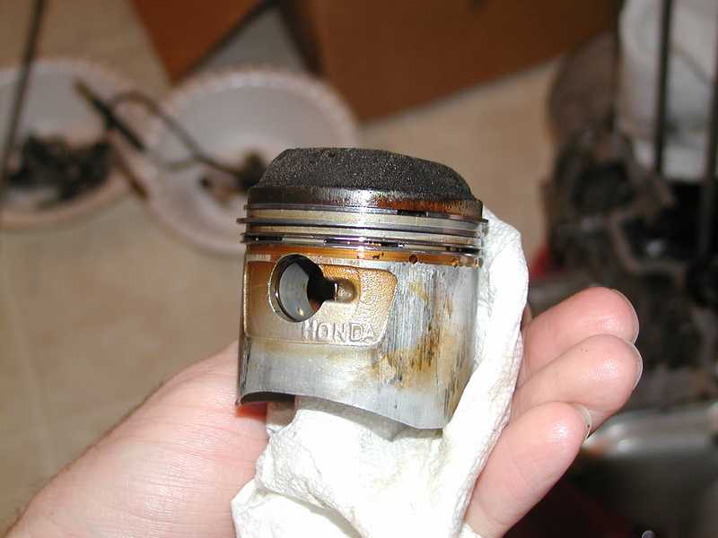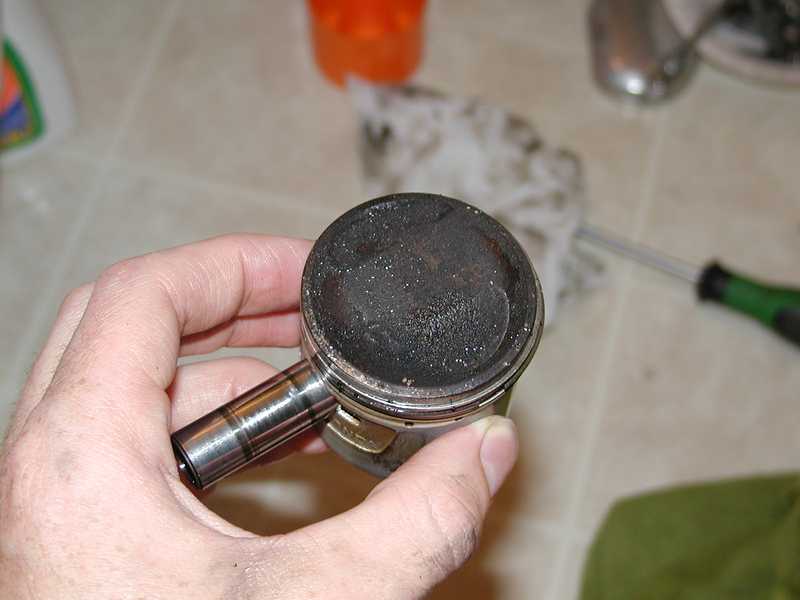 After I removed the little circlip on the end of the piston's pin, it was easy to remove the pistons. I also took off the rings so that I could clean them and look everything over. There are three rings all together, and the two thinner ones have markings to differentiate the top from the bottom. I was surprised at the level of carbon buildup on the pistons, and I'm looking forward to removing it.