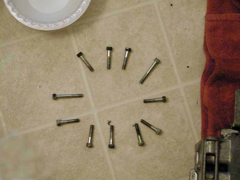Next I took off the left side cover. The bolt pictures are to remind me which holes correspond with the longer bolts. This side cover is not part of the oil sump system. I removed the cover, then removed the coil from the cover. I also took apart the clutch adjustment parts and cleaned out the grease. A little bit of cleaning left all of these parts ready for setting aside. Since I'm also in the midst of a kitchen renovation, I have some old pieces of counter top that serve the need for a table very nicely. The last picture on the second row shows that the o-rings go on the back dowels of the cylinder block.