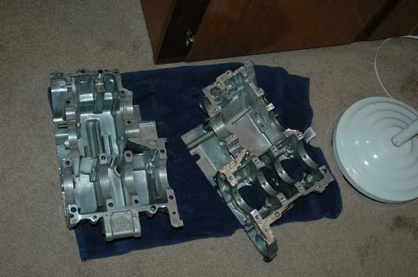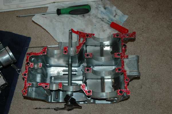 In this line you can see the remainder of the assembly for the top half of the case, along with the preparation for mating the top half. I used gasket sement from my local auto parts store. I should say too that during the reassembly, I sat next to the computer and found my pictures from disassembly to be extremely handy.