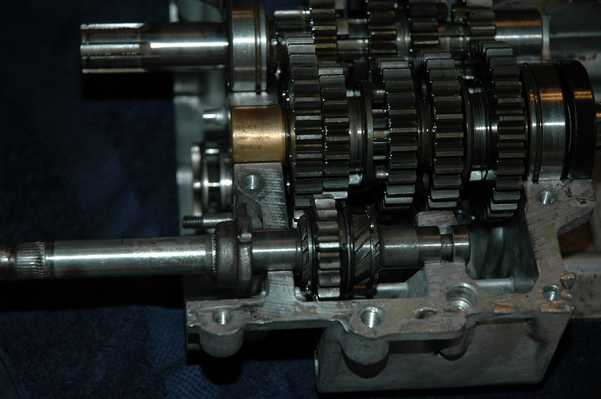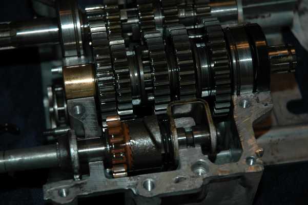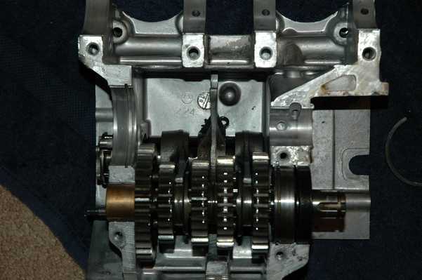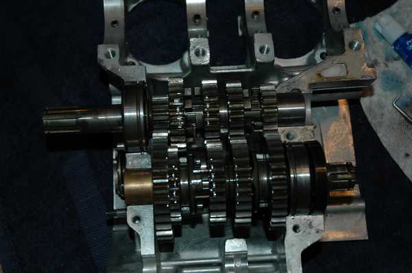 The engine went back together just about as the Haynes manual said it should. I did spend some time scratching my head and trying to figure out how the transmission worked. Everything took a better turn once I figured out that all three shifting forks didn't go on the same shaft. The third picture on the row above shows the drum/forks and the first half of the gears in place.