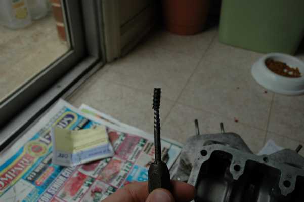 I started to go ahead and reassemble the top end, since I was planning to move and wanted to limit the number of loose parts. The head presented quite a few problems in my case. The first was the broken-off cam chain tensioner screw. Since it was broken off deep into the hole, I found that the extractor didn't work very well. It makes sense that the tapered extractor probably spread the remaining screw, further tightening it in the hole. That is the best explanation that I can figure for why I was able to break the extractor off in the screw, which in itself is quite a bit of trouble. Since it is made from some extremely hard steel, there is no hope for drilling the extractor out. Instead I decided to drill all around the tip of the remaining piece, in hopes of excavating it. That's when I started breaking drill bits in the hole, and that's when I decided to work on something else for a little while.