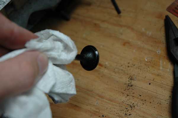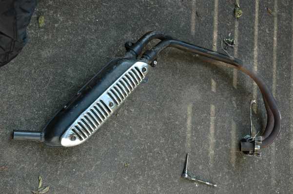 I was able to extract another broken screw from the top of the head with no trouble, and then I turned my attention to the exhaust. The exhaust shield was slightly damaged from a scuff with pavement in its last life, and slightly rusted from the time since then. I removed the screws and polished the shield, and thought about painting the exhaust pipes with some high-temp black paint. In the end I chickened out about that step, worried that the paint wouldn't stick and would make things look worse.