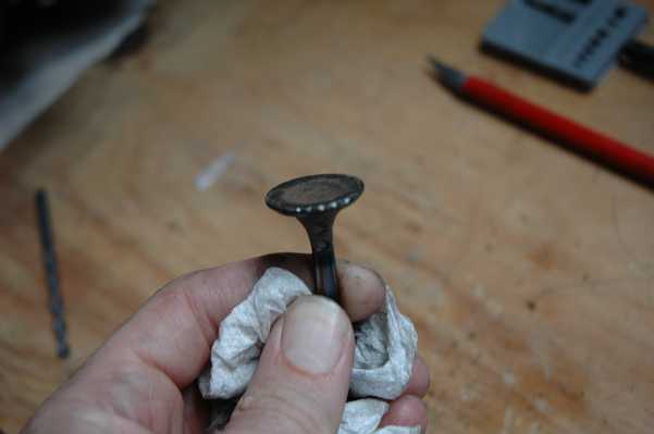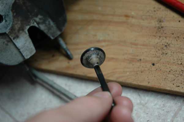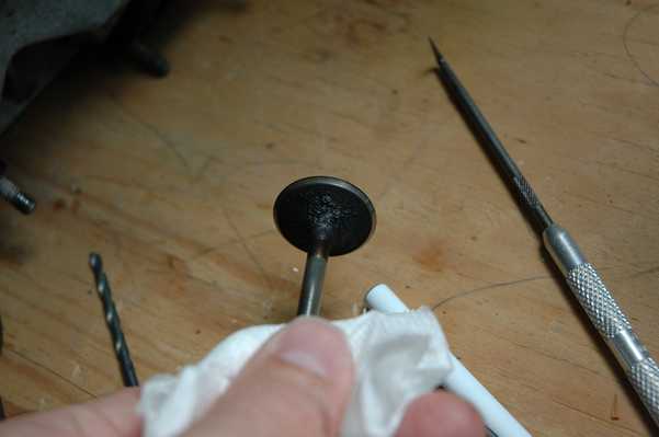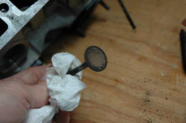 Speaking of worse, that is about when I found the exhaust valve problem. With the cam shaft removed there is no reason for the valve to be open, but I could look down the exhaust outlet and see light coming through. This was an indication that the exhaust valve was stuck open. There was plenty of carbon buildup around the valve seat, but it turned out that his was more of a result of the true problem, which was a bent valve. I guess I did this during the spark plug thread repair, as indicated by the shiny marks on the valve. You can see that there are also was a lot of carbon buildup on the other valves.