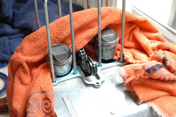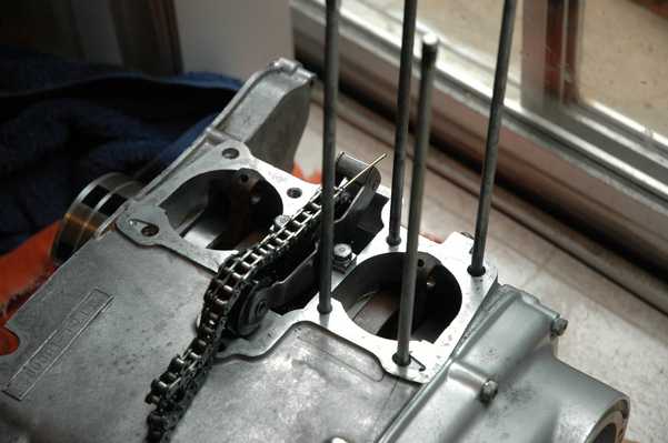 Getting the cam chain in the right place is easy when the cylinder block isn't in place, but it gets harder as the stack gets taller. I took the studs off for easier working on the engine, so it was time to put them back on. It was also fairly easy to get the pistons and rings back into the cylinder, thanks to a little oil and some patience.