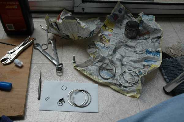 My first step was to clean the parts, lay them out, and see how many of them I screwed up while taking them apart. Luckily, there were few. I did find a few parts that broke themselves, including the cam chain tensioner and the kick start ratchet. I was able to find a bottom end from a CL on ebay for $30 with shipping, with hopes that I would be able to sell some of the parts that I didn't need. As a matter of fact, I still have quite a few left, so let me know if you need anything from the bottom end.