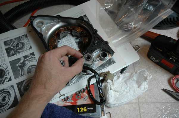 When I was finished taking things apart, I found a little ball rolling around. Since I had no idea where it came from, I took some time to check out the microfiche. It turns out that it goes on the left side of the clutch pushrod. You can see the ball in the last picture above.