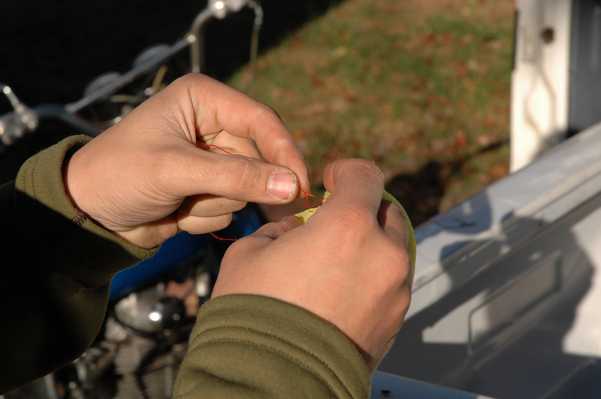 In asking around about what could be causing my problem I figured it might be time to replace the air filters. The local places didn't have any bulk foam to cut filters from, and I didn't want to buy the $25 that the guy is selling on ebay. Instead on Scott's whim we decided to try NAPA. With great luck, we found a pre-filter for a lawn mower. The picture quality isn't great, if you could see well enough it says "Replaces: Briggs and Stratton 270728, 271794 John Deere M96098 Fits 7-02210 Air Filter." The NAPA Bar code says R789337, and the bar code says 7 07390 44114 6 and there are also 060603 7499-E2 written on there somewhere. The best part is that two of the filters from NAPA will give you enough foam to make three motorcycle filters, and you should be able to get them both for about $4. As Scott demonstrates, you do have do a little bit of stitching. The only other catch is that you have to center the foam over the holes on the can, as you can see below. When centered, the foam does provide coverage of the intake air, but if the foam was about 1/2" longer, it would fit perfectly for length. But, for $4, it will do fine for me.