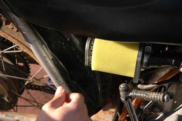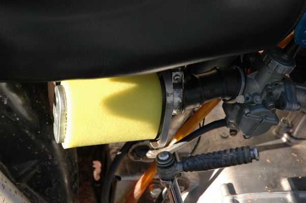 April 2008 Update: Read on to find out about the Uni filter. Also, if you use this method, don't forget to oil the foam. I've since learned that on an air filter like this, the oil actually catches dirt, and the foam is just there to hold the oil in place. A dry foam filter does little to stop dirt.